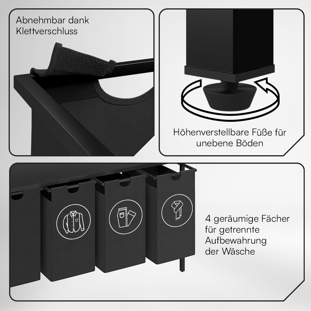 Die Handhabung ist denkbar einfach: Dank Klettverschlüssen lassen sich die einzelnen Wäschesäcke mühelos entnehmen und wieder anbringen. Eine integrierte Bodenplatte aus Kunststoff in jedem Sack verhindert ein unschönes Durchhängen und sorgt dafür, dass die Säcke stets ihre Form bewahren, selbst wenn sie voll beladen sind.