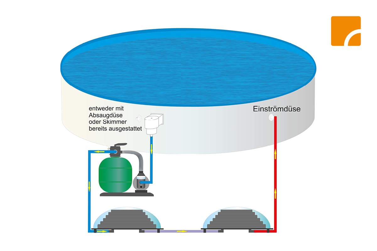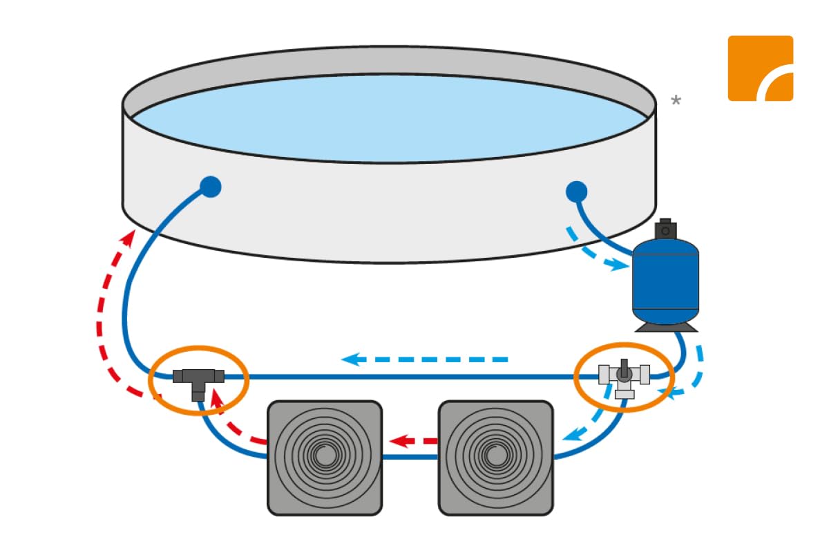 Für eine optimale Leistung wird der Kollektor nach der Filteranlage installiert. Um die Effizienz weiter zu steigern, können Sie ein optionales Bypass-Set verwenden. Damit reduzieren Sie die Durchflussgeschwindigkeit, sodass das Wasser länger im Kollektor verweilt und mehr Sonnenwärme aufnehmen kann.