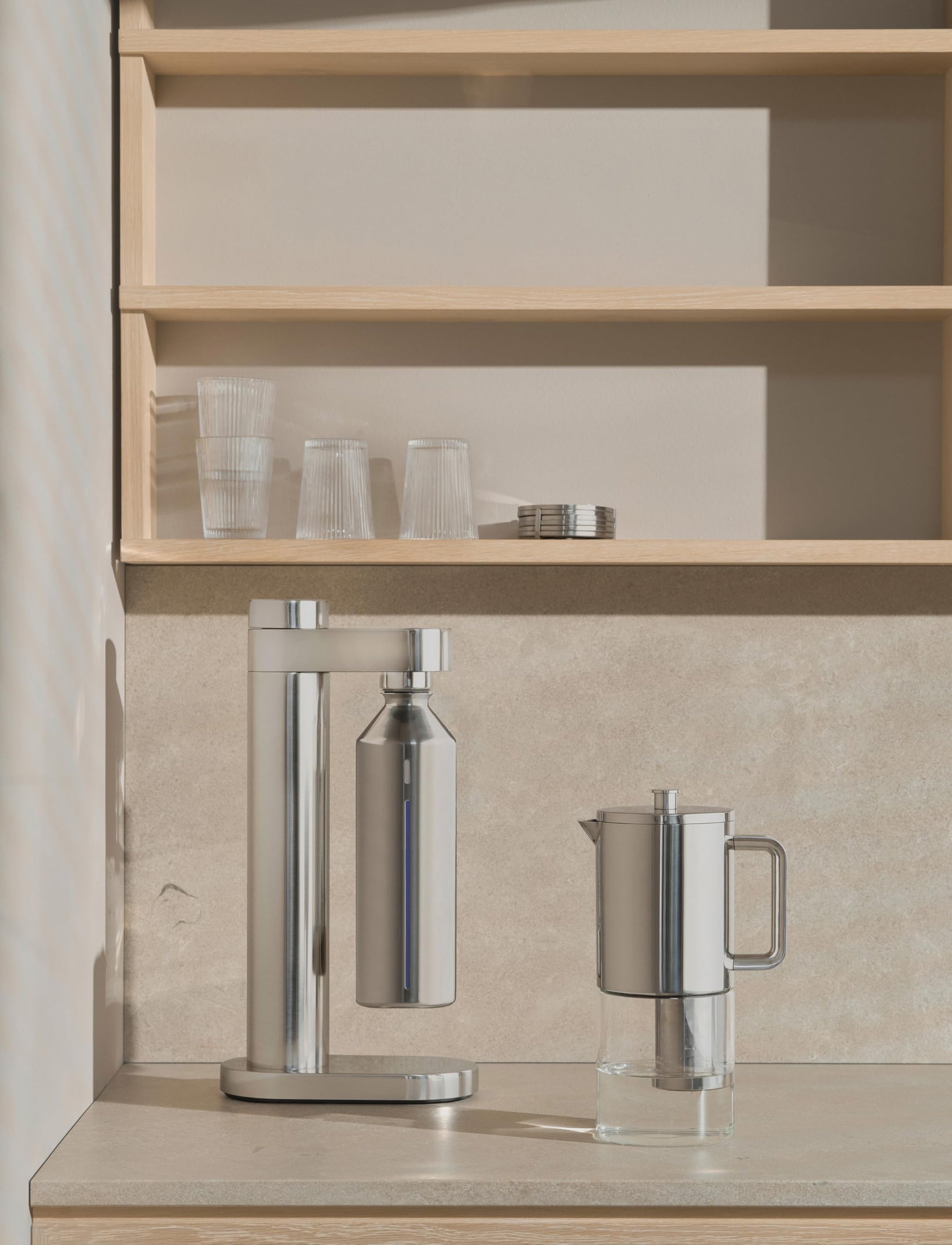 Das von Søren Refsgaard entworfene Design besticht durch minimalistische, skandinavische Eleganz. Die klare, zylindrische Form, die hochwertige Edelstahl-Oberfläche und der nahtlos integrierte, ultraflache Behälter für die CO2-Patrone machen den Wassersprudler zu einem stilvollen Highlight, das sich harmonisch in jede moderne Küche einfügt.