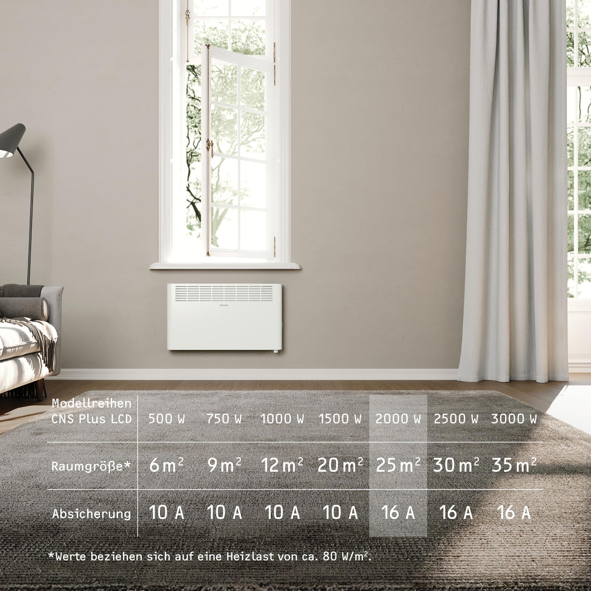 Der Konvektor ist mit seiner 2000-Watt-Leistung ideal als Haupt-, Übergangs- oder Zusatzheizung für Räume bis circa 25 m² geeignet. Dank seines geräuschlosen Betriebs und eleganten Designs passt er perfekt in Wohnzimmer, Schlafzimmer oder Arbeitszimmer.