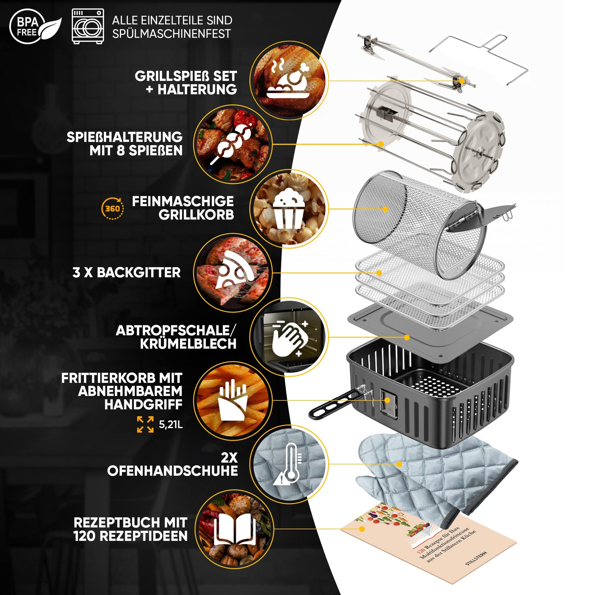 Neben der Heissluftfritteuse und dem Zubehör erhalten Sie ein deutschsprachiges XXL-Rezeptbuch mit 120 Ideen. Sie sind zudem durch eine 2-jährige Herstellergarantie, eine 30-tägige Geld-zurück-Garantie und lebenslangen Support durch das deutsche Service-Team bestens abgesichert.
