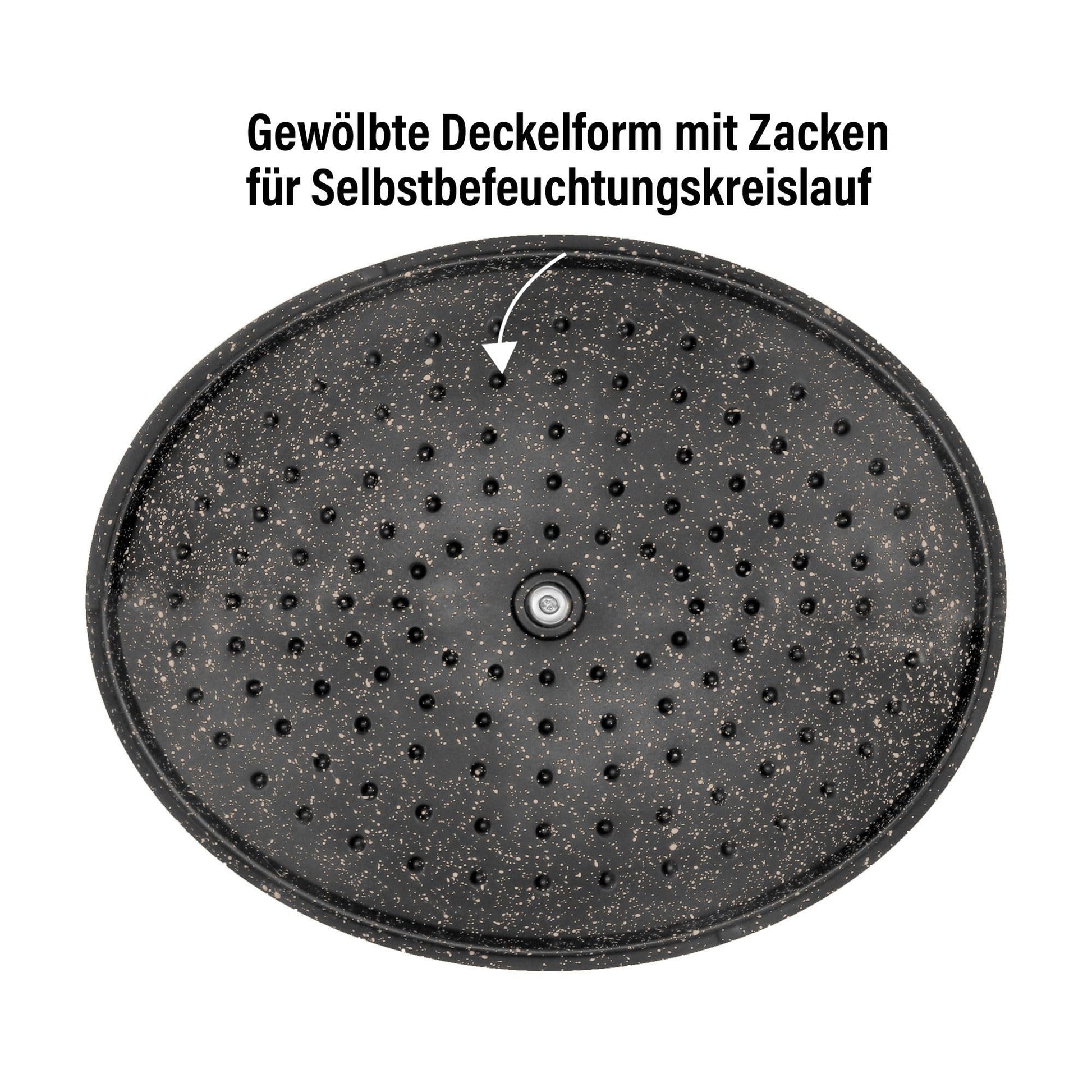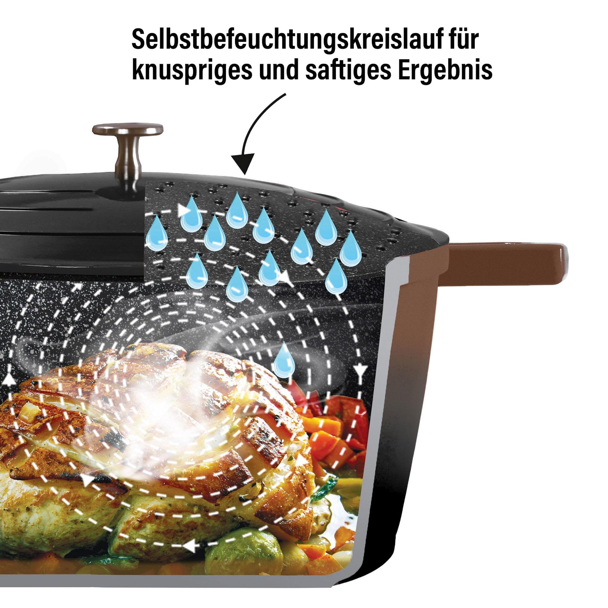Ja, absolut! Der Aluguss-Bräter ist nicht nur perfekt für Gänsebraten oder Schmorgerichte, sondern auch hervorragend zum Brotbacken geeignet. Der speziell konzipierte Deckel lässt die Luft im Inneren zirkulieren, was für einen besonders saftigen Teig und eine herrlich knusprige Kruste sorgt.