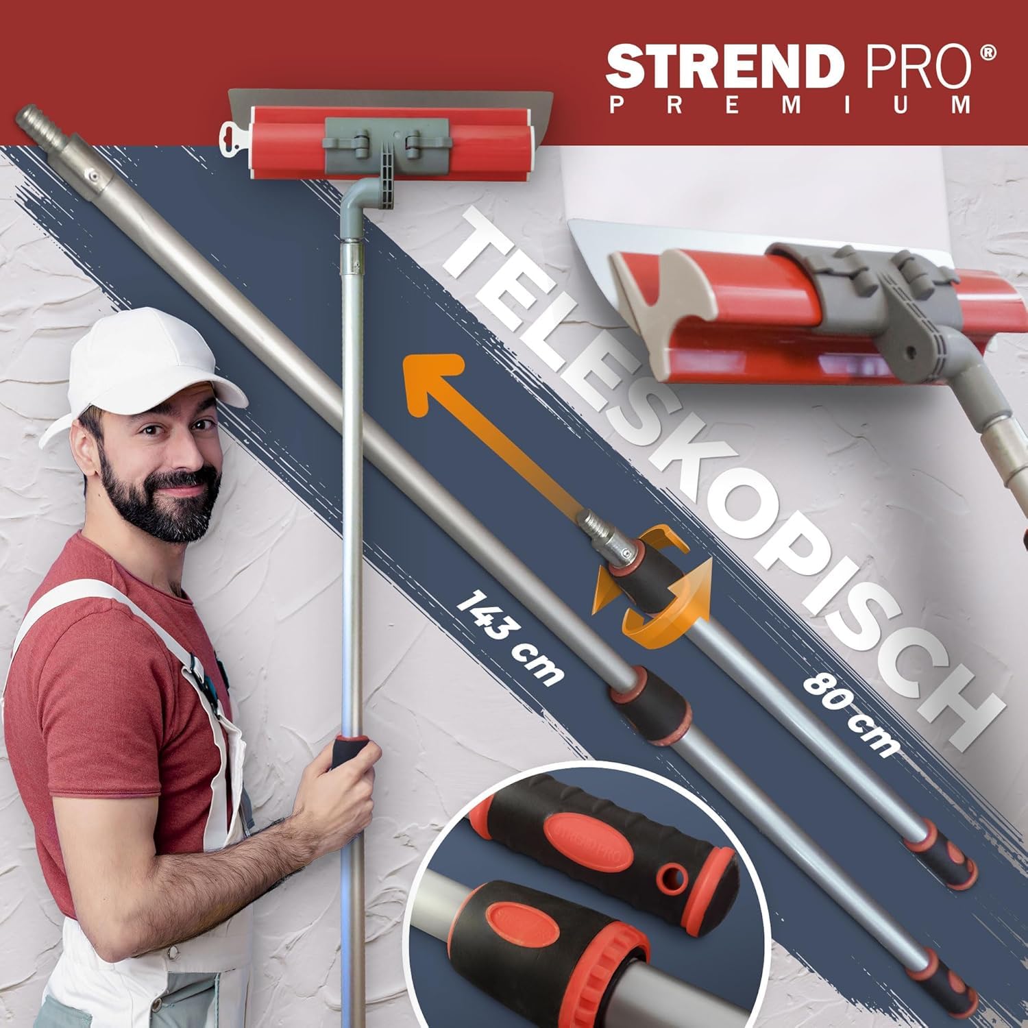 Der ergonomische Z-Griff sorgt für eine optimale Kontrolle und ermöglicht ermüdungsfreies Arbeiten auch bei langen Einsätzen. Die flexible 0,3 mm Edelstahlklinge passt sich dem Untergrund an und sorgt für ein ebenmässiges Ergebnis ohne grossen Kraftaufwand, während die Teleskopstange das Bearbeiten hoher Wände und Decken erleichtert.