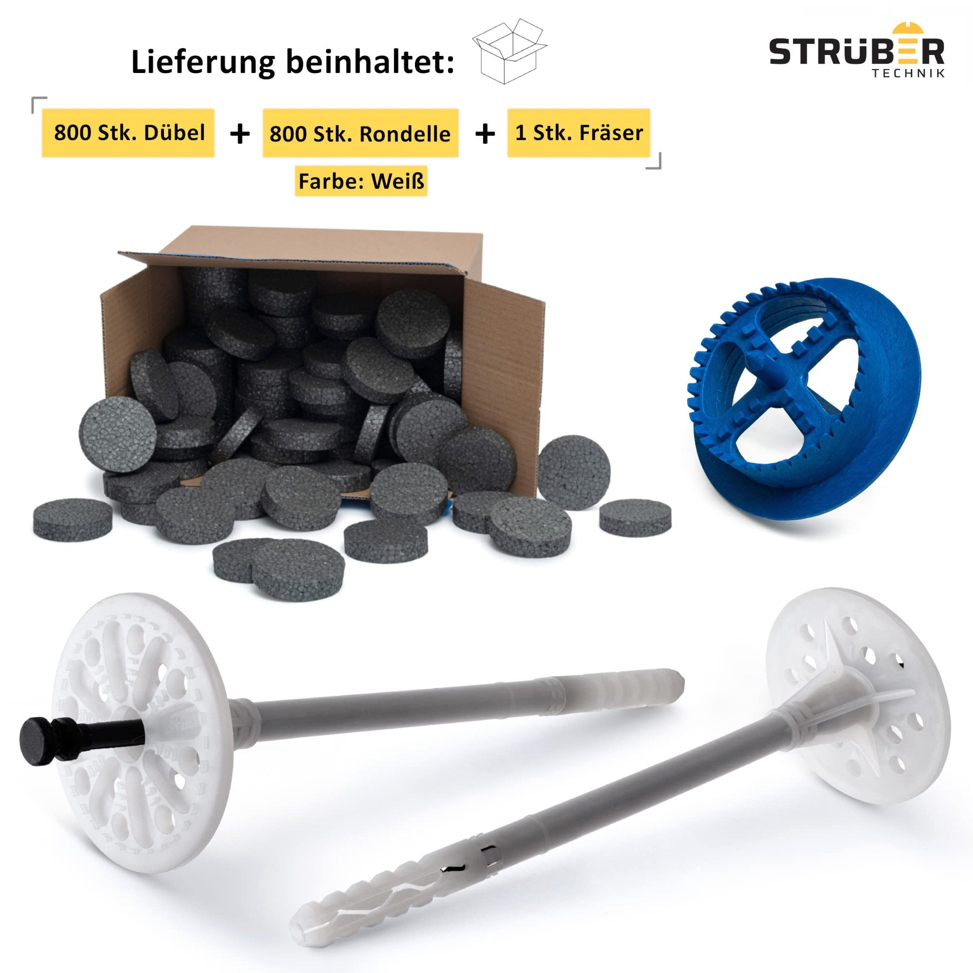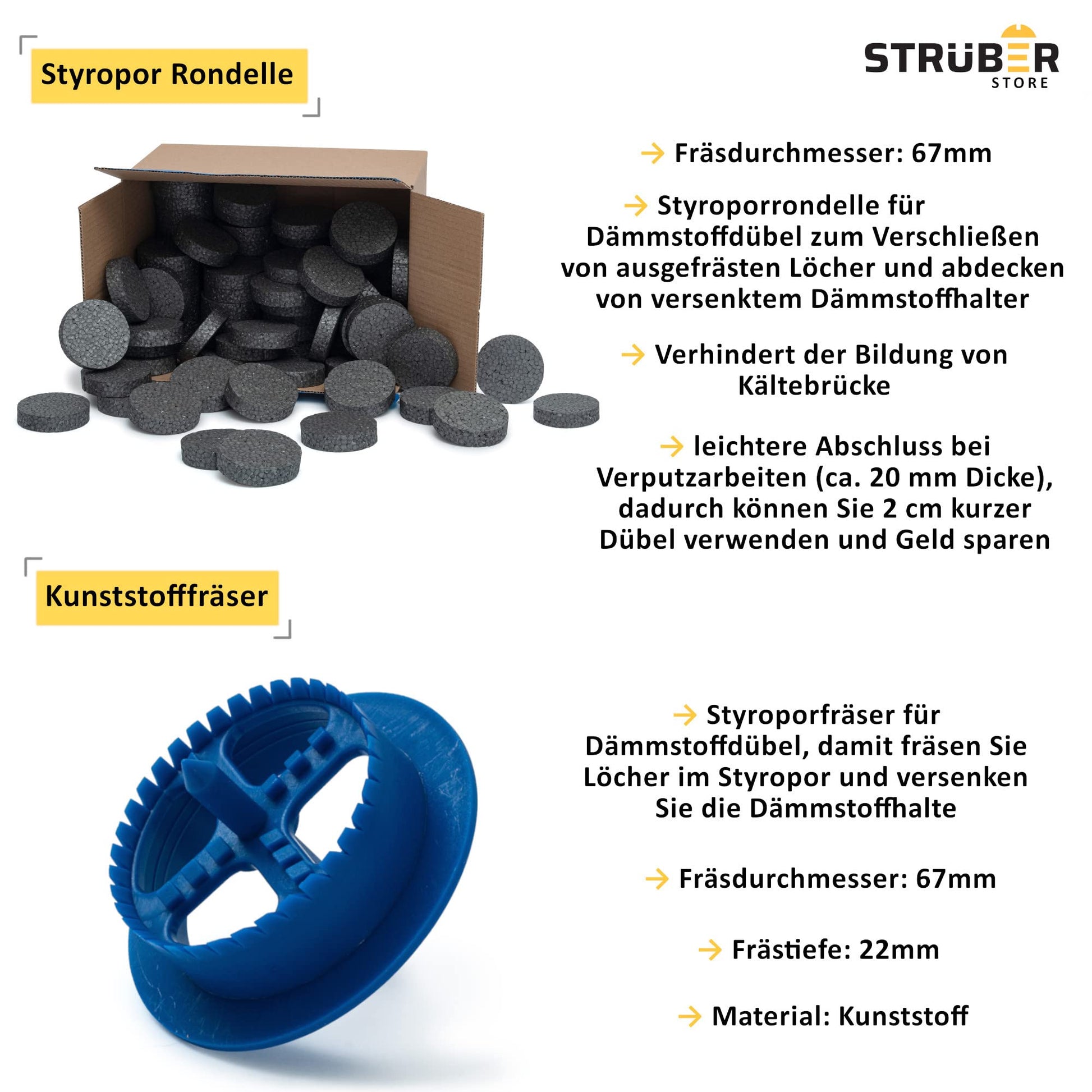 Das Set beinhaltet 800 ETA-zertifizierte Dämmstoffdübel im Format Ø10x220mm mit robusten, glasfaserverstärkten Kunststoffnägeln, 800 exakt passende graue Styropor-Rondellen (Ø 67mm) und einen spezialisierten Styroporfräser für die versenkte Montage.