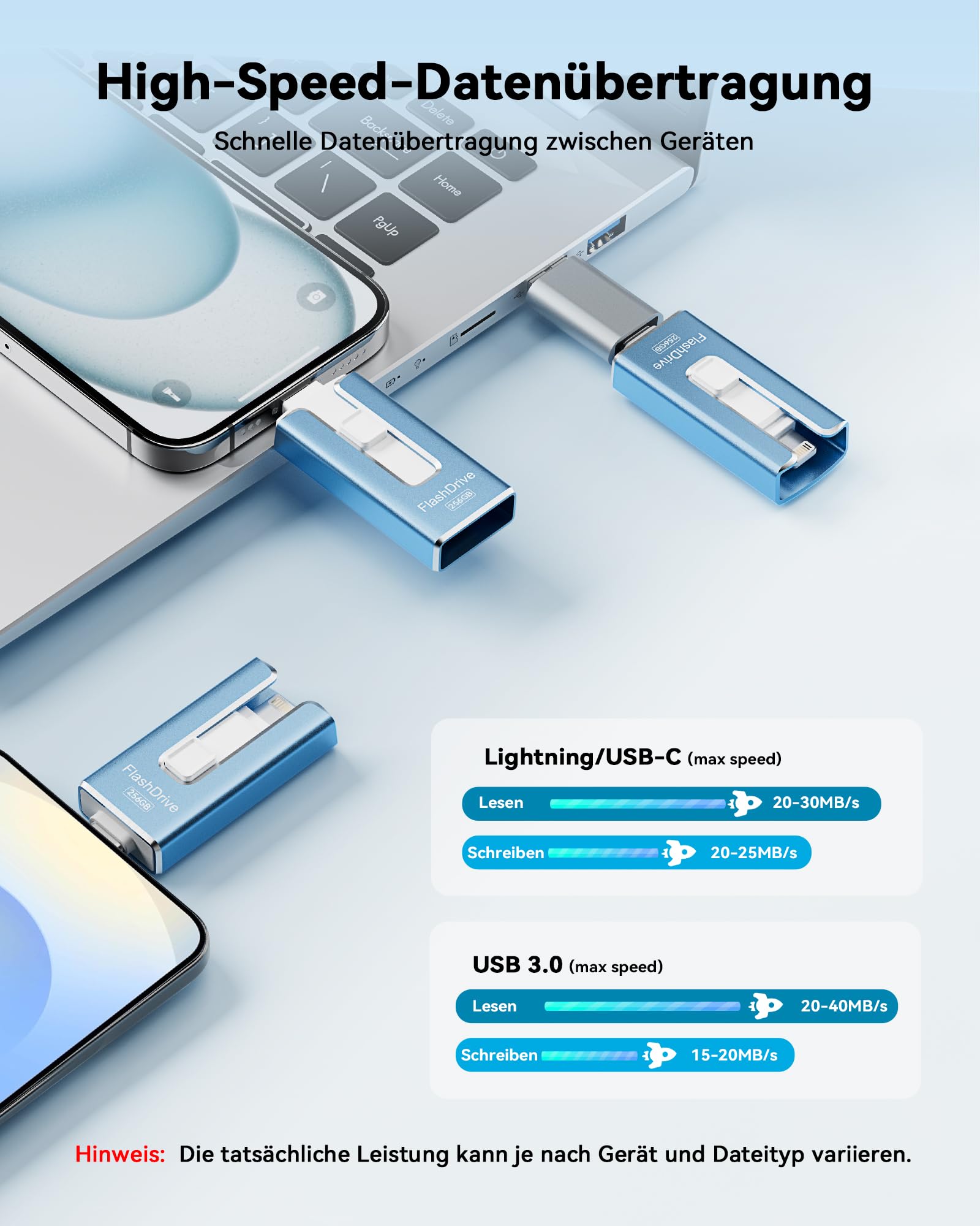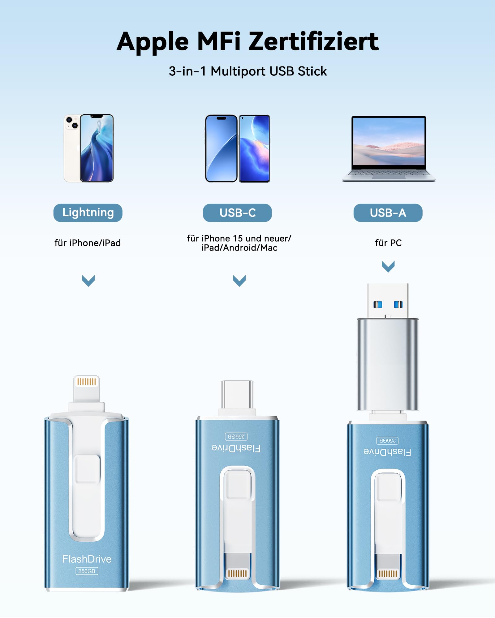 SUDEHO USB Stick 256 GB MFi Lightning/USB-C – Blau