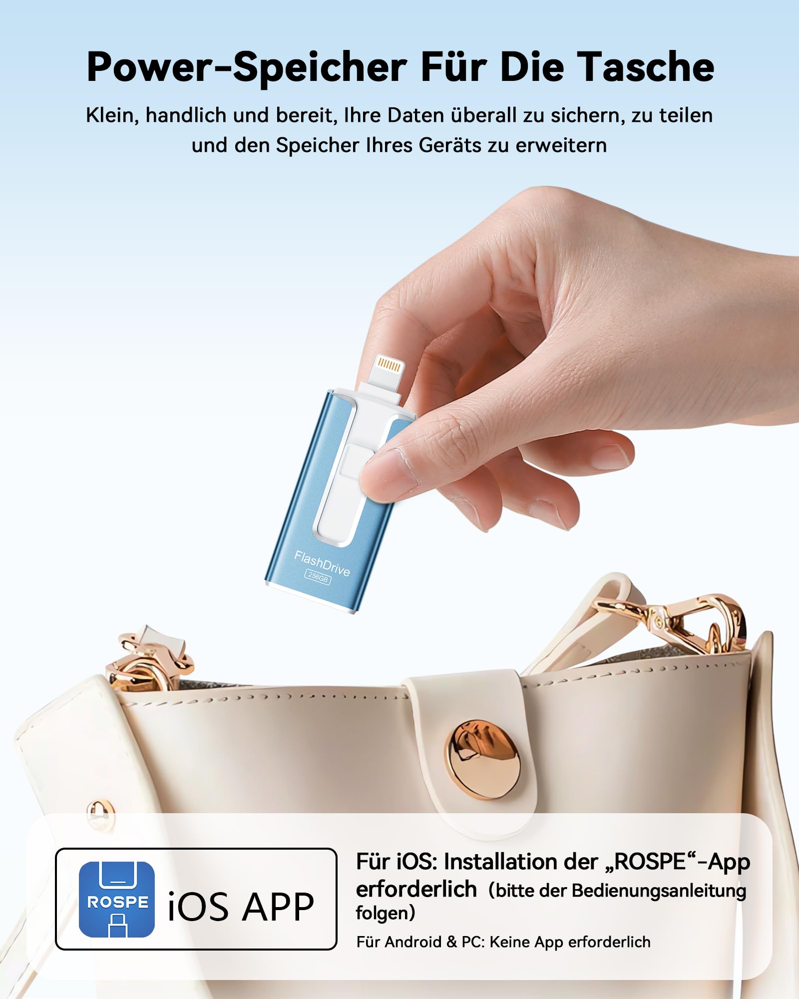 Absolut. Der Stick ist MFi-zertifiziert, was eine offizielle Apple-Zulassung für sichere und problemlose Kompatibilität bedeutet. Zusätzlich können Sie über die „ROSPE“-App für iOS Ihre privaten Dateien mit einem Passwort verschlüsseln, um sie vor unbefugtem Zugriff zu schützen, selbst bei Verlust des Sticks.
