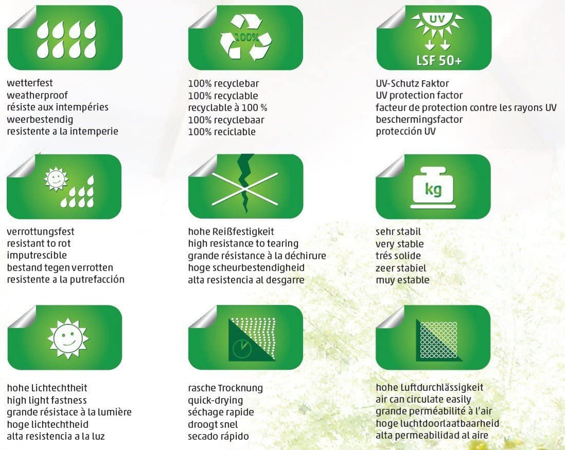 Das verwendete Polypropylen-Gewebe bietet umfassenden Schutz und herausragende Eigenschaften. Es ist nicht nur absolut wetterfest und verrottungsfest, sondern auch extrem reissfest und stabil. Ein hoher UV-Schutzfaktor von 50+ bewahrt die Farbe Ihres Sonnenschirms vor dem Ausbleichen. Gleichzeitig sorgt die hohe Luftdurchlässigkeit für ein gutes Klima unter der Abdeckung und ermöglicht ein schnelles Trocknen. Ausserdem ist das Material umweltfreundlich und zu 100% rezyklierbar.