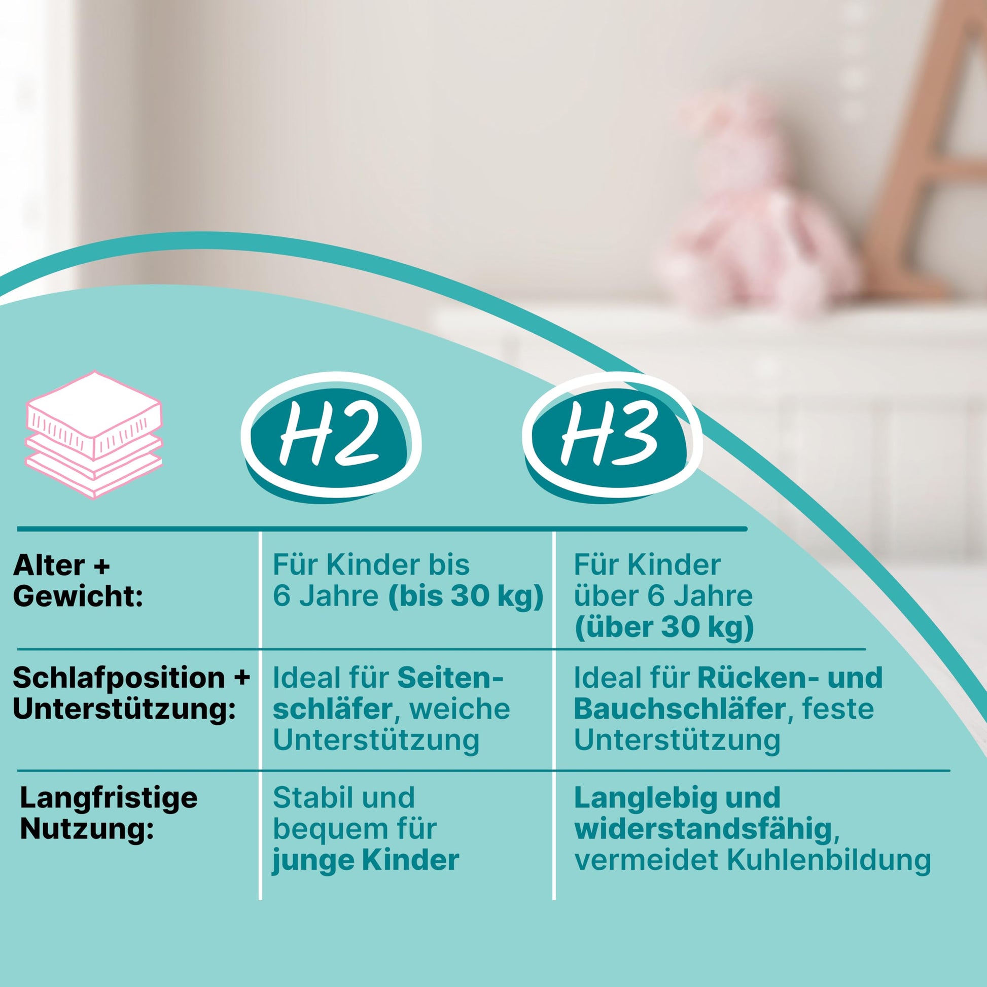 Die Matratze hat den Härtegrad H2 (mittel), der ideal für wachsende Kinder und Jugendliche ist. Er bietet eine optimale Balance aus sanftem Komfort und notwendiger Unterstützung, um eine ergonomisch korrekte Liegeposition zu fördern und die gesunde Entwicklung der Wirbelsäule zu unterstützen.