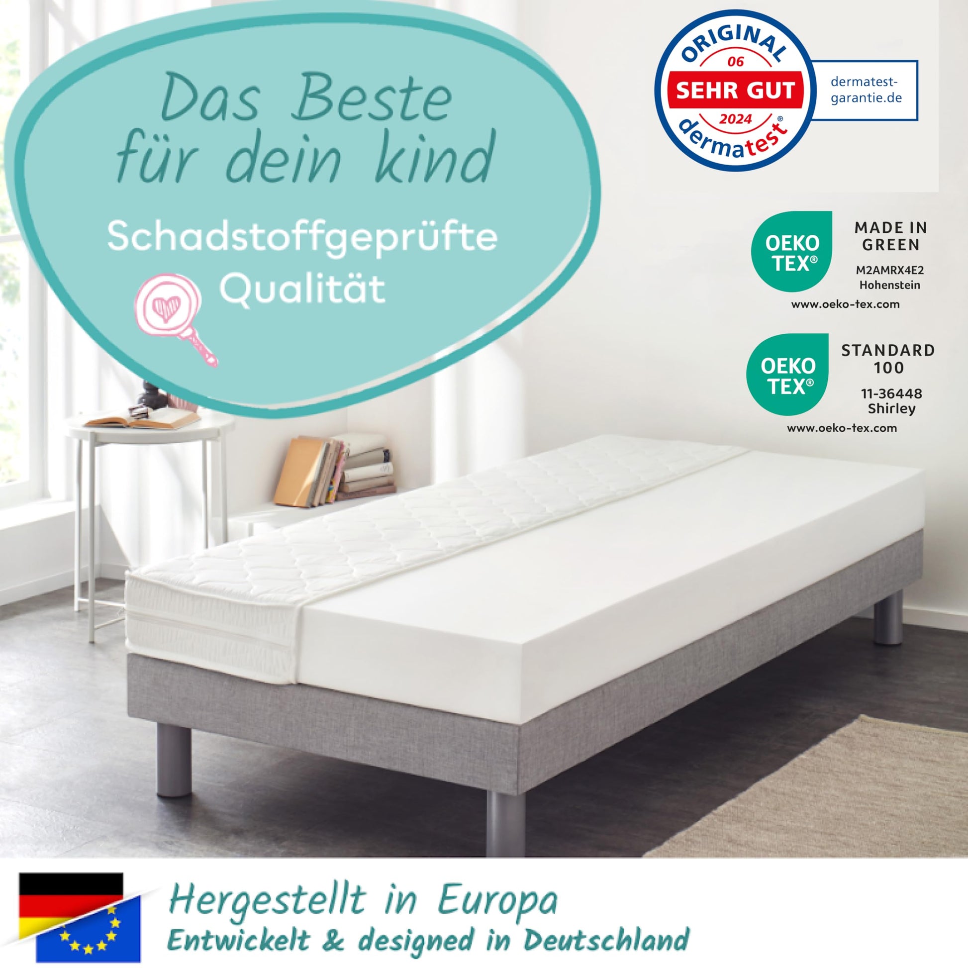 Ja, die Matratze ist absolut sicher. Sowohl der Matratzenkern als auch der Bezug sind nach Oeko-Tex Standard 100 zertifiziert. Das garantiert, dass alle Materialien auf Schadstoffe geprüft und somit besonders hautfreundlich und unbedenklich für empfindliche Kinderhaut sind. Der waschbare Bezug trägt zudem zu einem hygienischen, für Allergiker vorteilhaften Schlafklima bei.