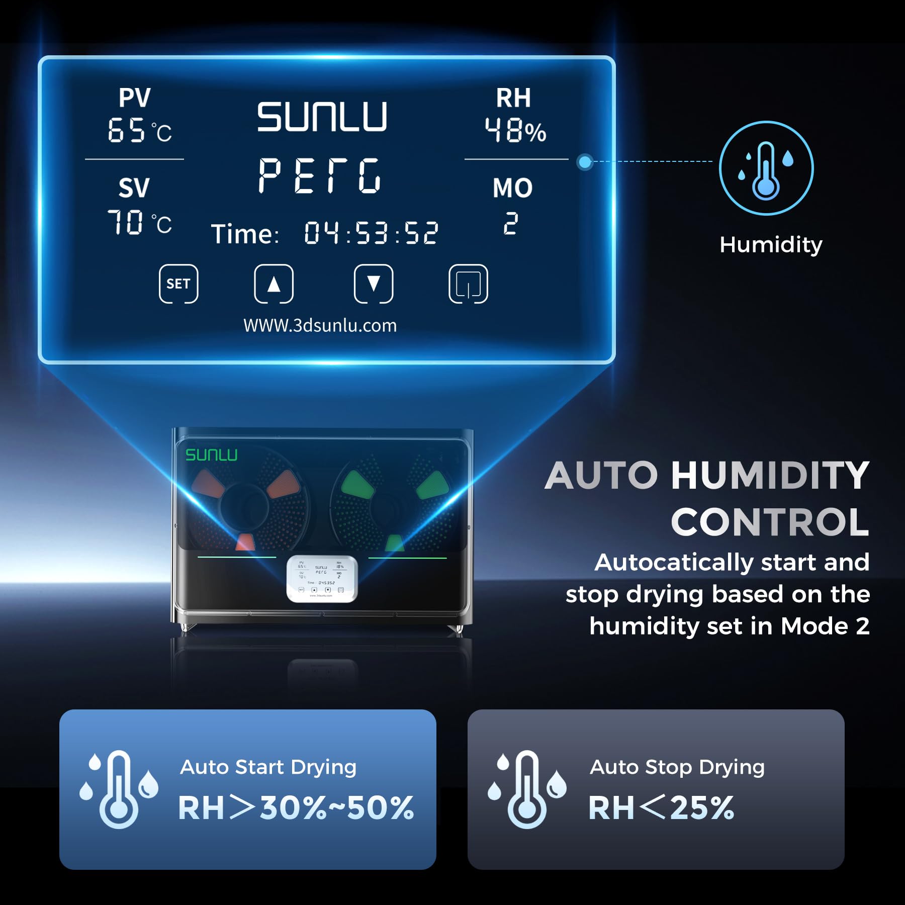 - Intelligente Feuchtigkeitskontrolle: Ein automatischer Modus hält die Luftfeuchtigkeit in einem vordefinierten Bereich (z.B. 30–50 %) und verhindert durch rechtzeitiges Pausieren ein Übertrocknen des Filaments.