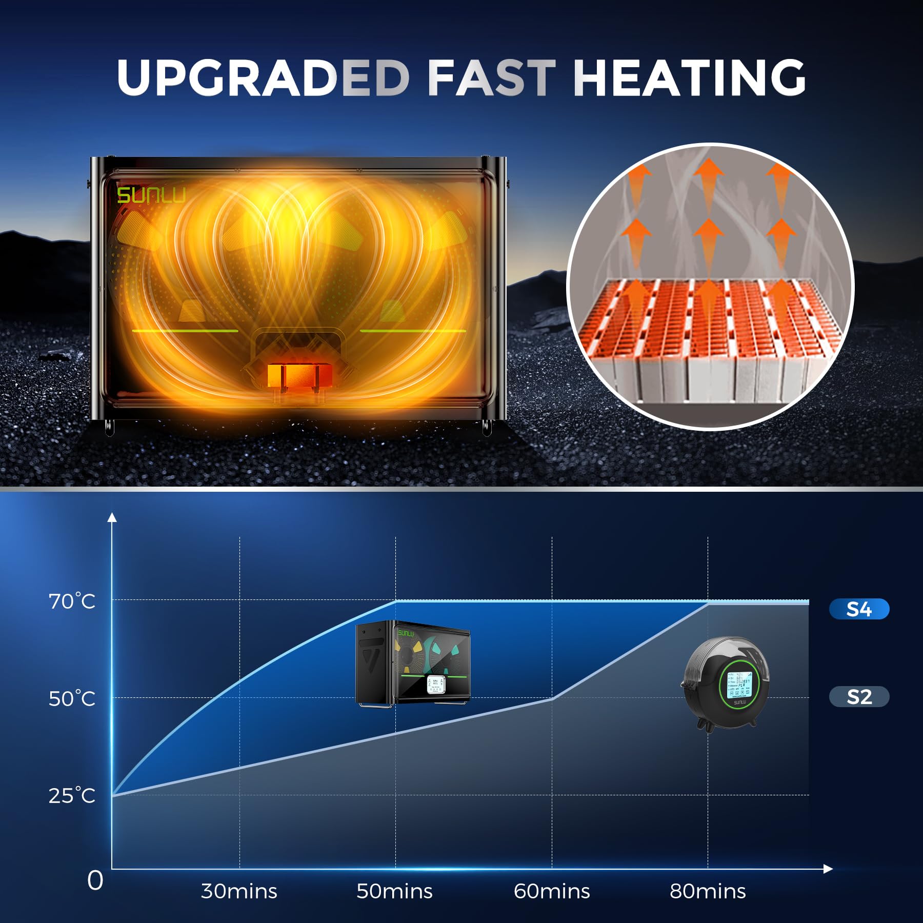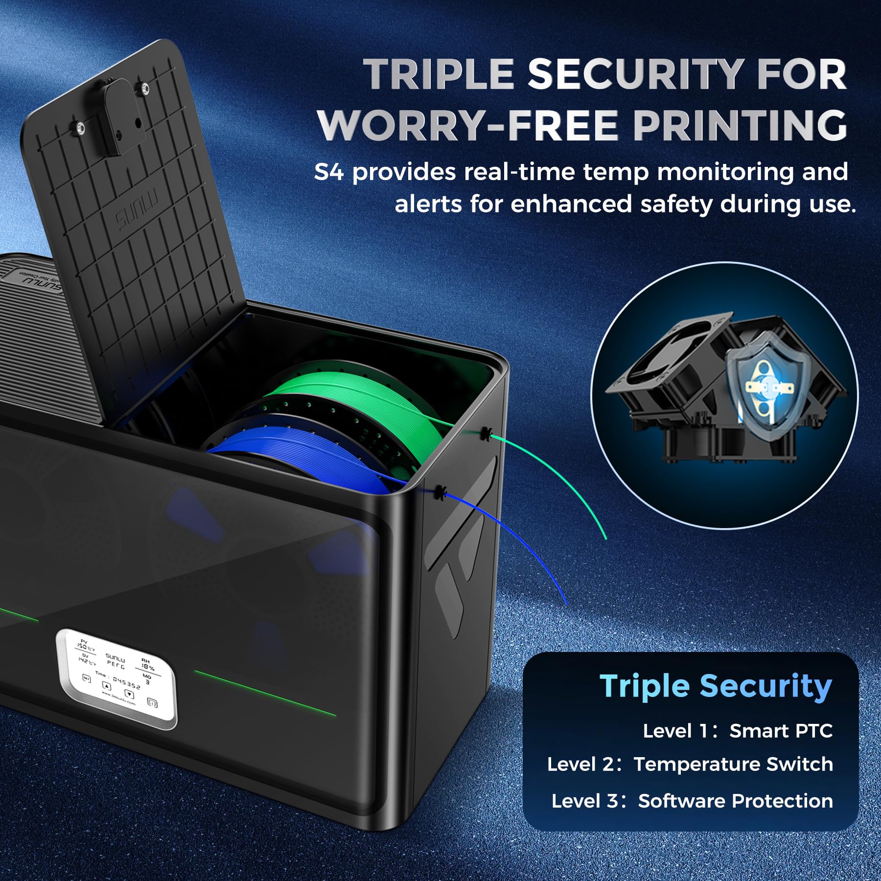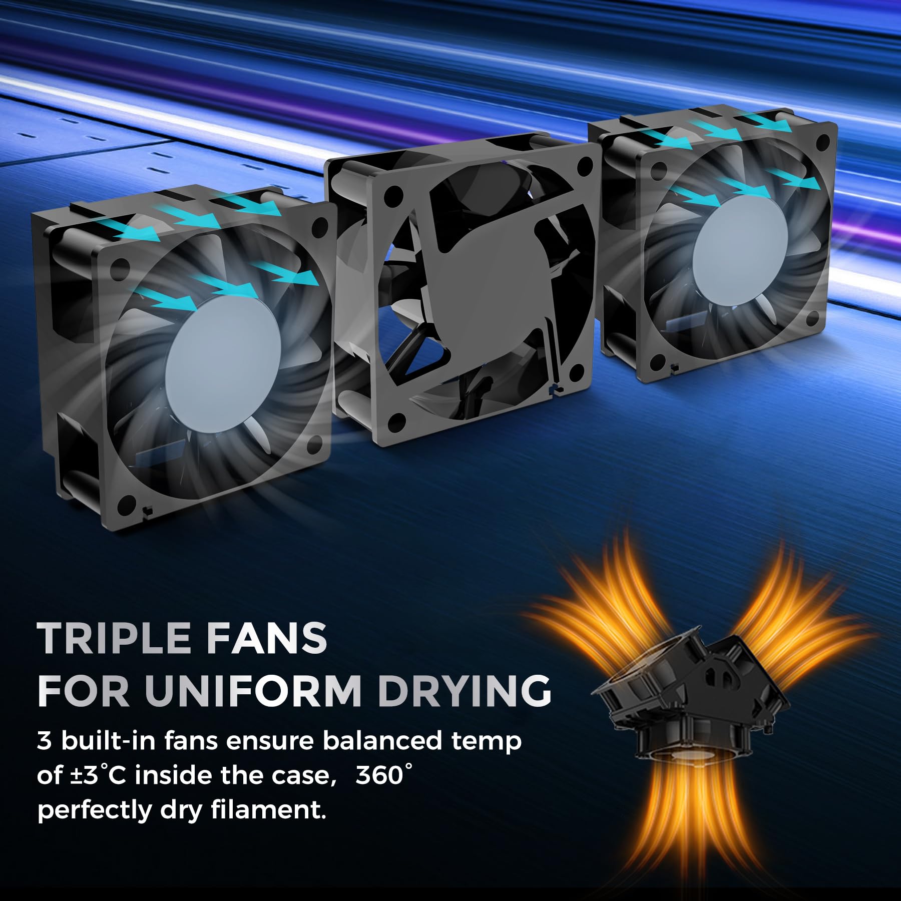 Die S4 nutzt ein leistungsstarkes 350-Watt-PTC-Heizelement, das ein extrem schnelles Aufheizen ermöglicht – beispielsweise von 25 °C auf 50 °C in nur 30 Minuten. Zusammen mit drei Ventilatoren für eine gleichmässige Wärmeverteilung trocknet sie Filament rund 50 % effizienter als viele andere Geräte auf dem Markt.