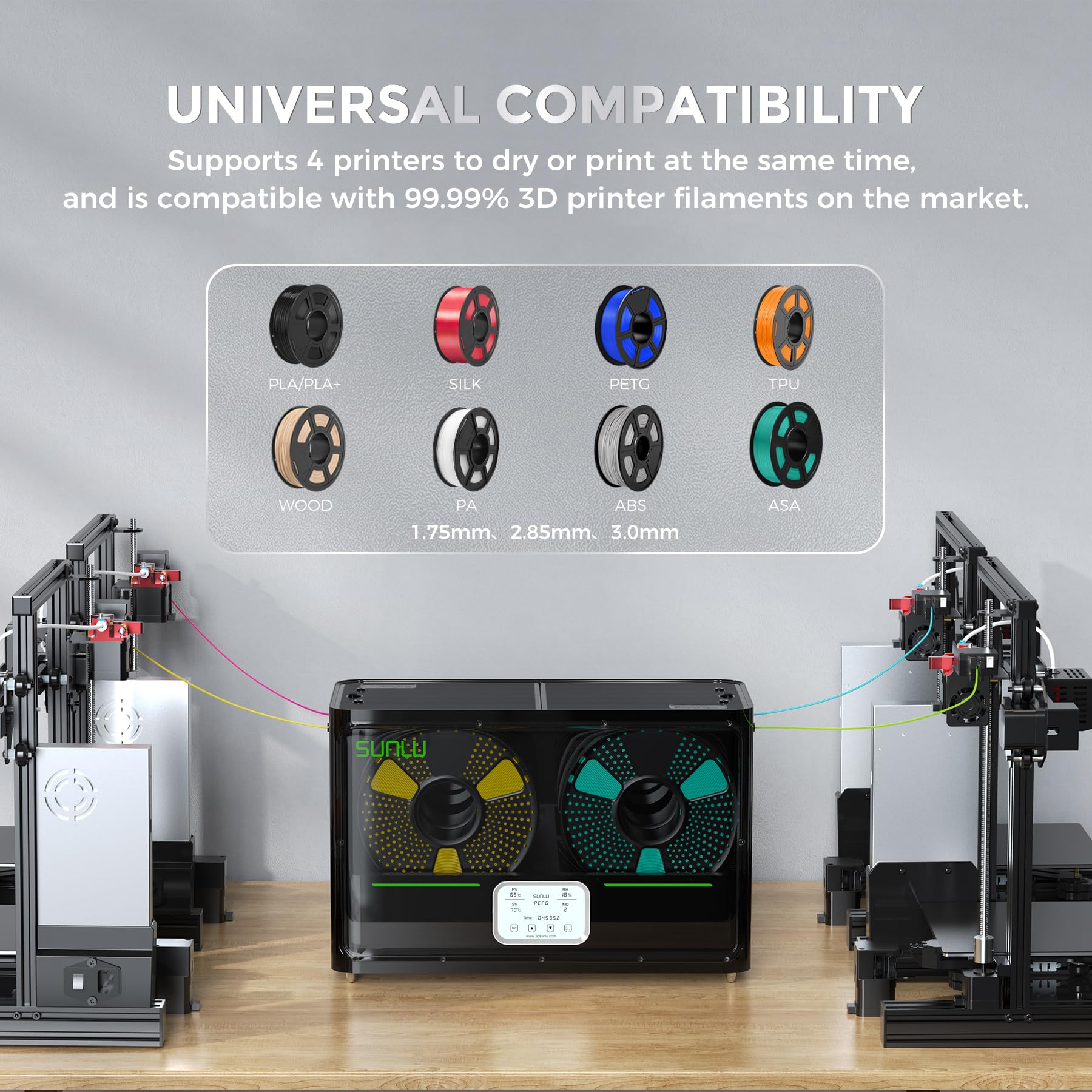 - Hohe Kompatibilität: Das Gerät ist mit allen FDM-3D-Druckern kompatibel, kann bis zu vier Drucker gleichzeitig versorgen und eignet sich für 99 % der auf dem Markt erhältlichen Filamente.