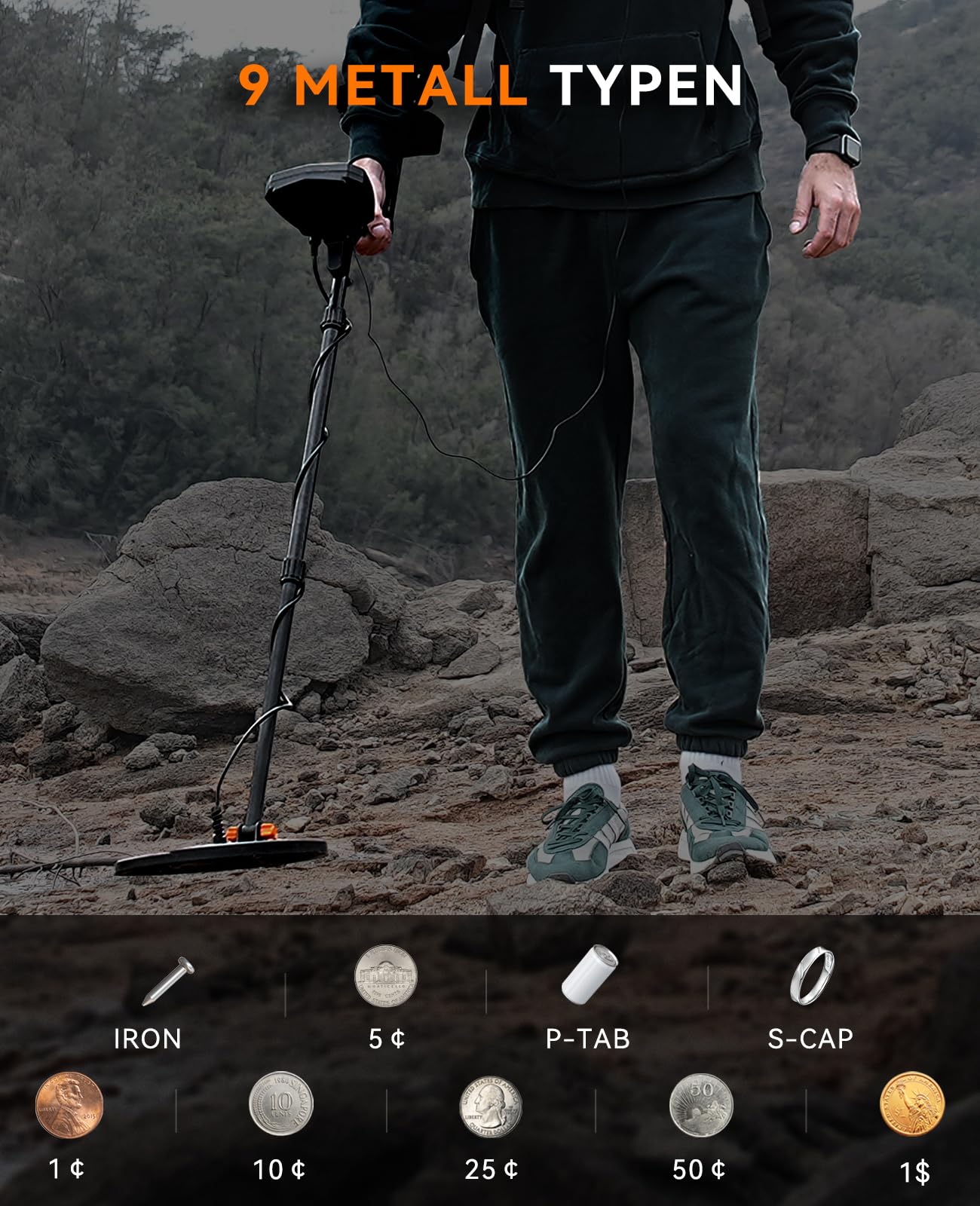 Der Detektor kann bis zu neun verschiedene Metallarten unterscheiden und erreicht dank des verbesserten DSP-Chips eine Suchtiefe von bis zu 25 cm (10 Zoll). Über die verschiedenen Modi können Sie gezielt nach wertvollen Metallen suchen und unerwünschte Objekte wie Eisenschrott einfach ignorieren.