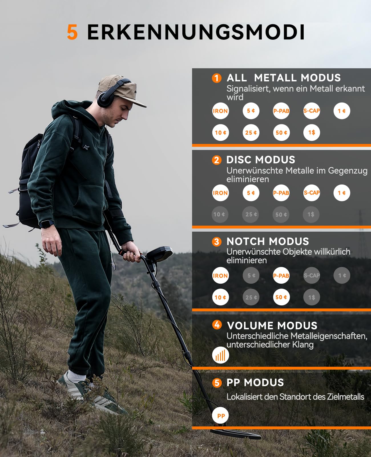 - Fünf Suchmodi und 9 Metallarten: Wählen Sie zwischen den Modi ALL METAL, DISC, NOTCH, VOLUME und PINPOINT, um Ihre Suche gezielt auf bis zu neun verschiedene Metallarten auszurichten und unerwünschte Objekte einfach auszufiltern.