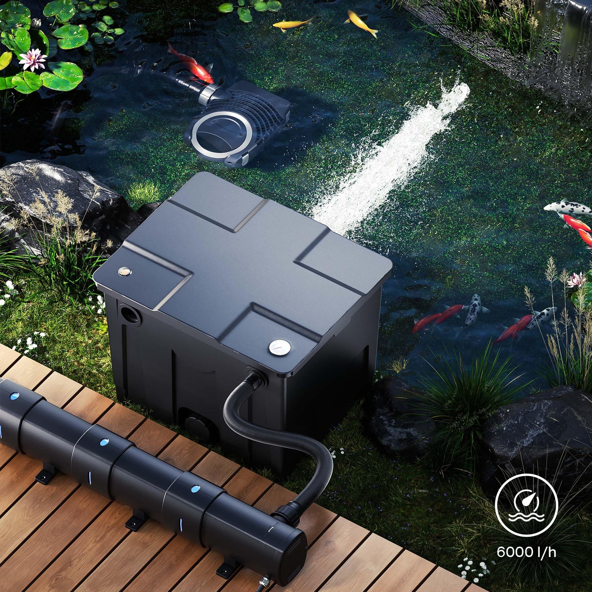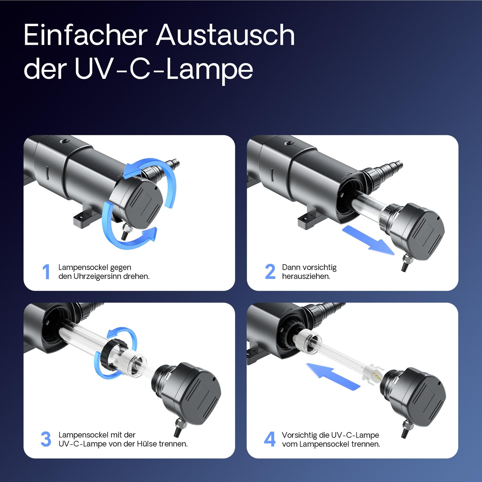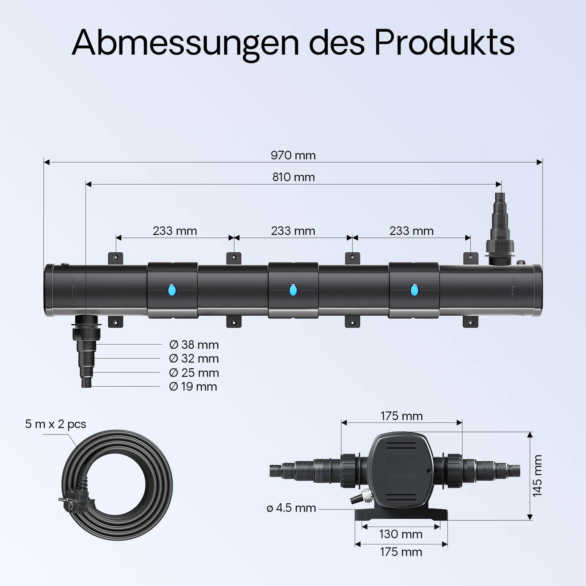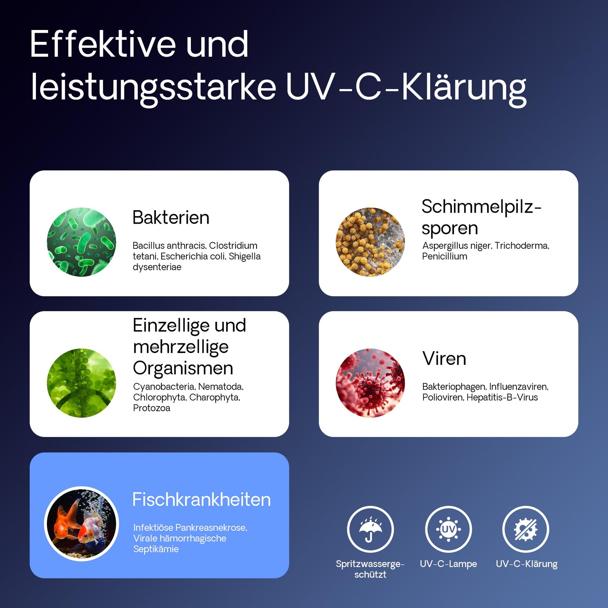 - Effektive UVC-Bestrahlung: Unterbindet zuverlässig die Vermehrung von Schwebealgen, schädlichen Bakterien und Keimen, welche für grünes Wasser verantwortlich sind.