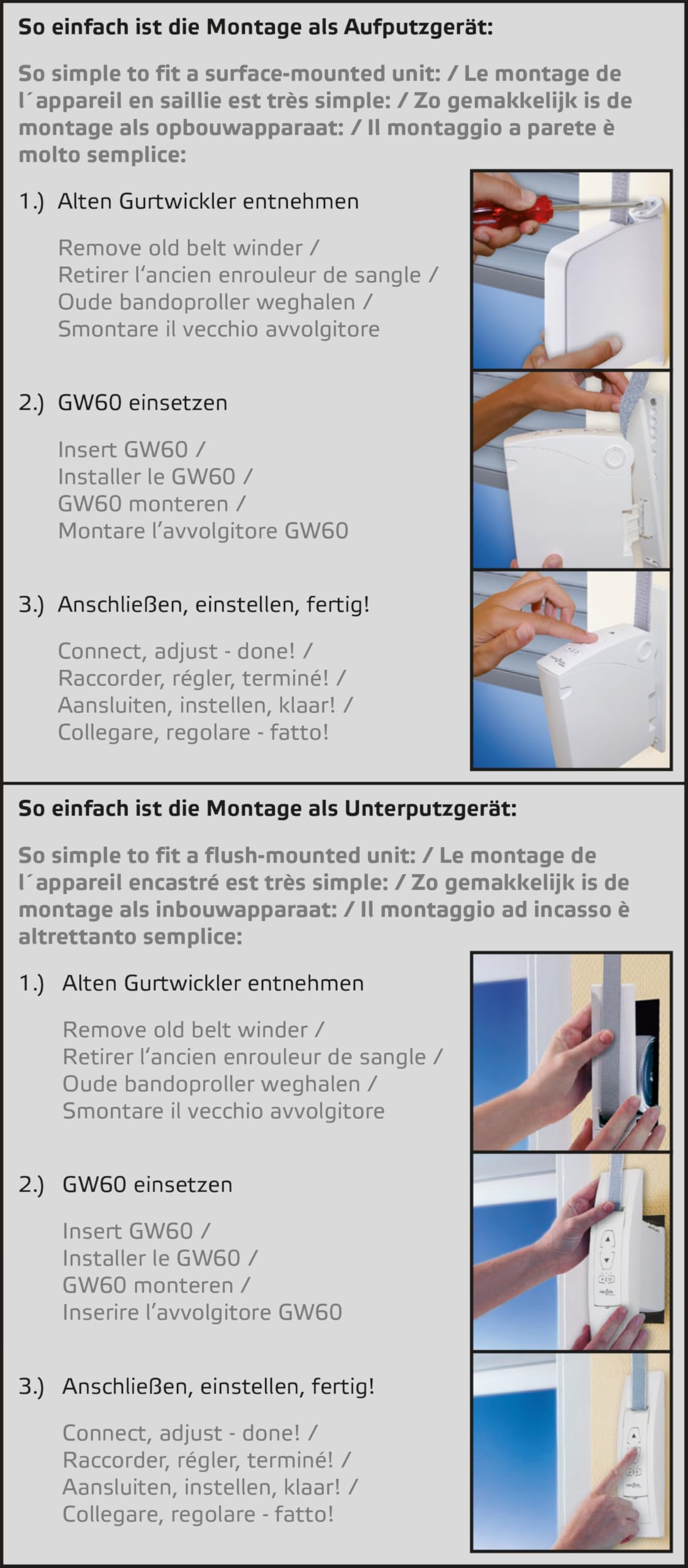 Die Installation ist sehr einfach und in der Regel in nur 10 Minuten erledigt. Da Motor und Steuerung bereits in dem kompakten Gehäuse integriert sind, kann er unkompliziert gegen den alten, manuellen Gurtwickler ausgetauscht werden.