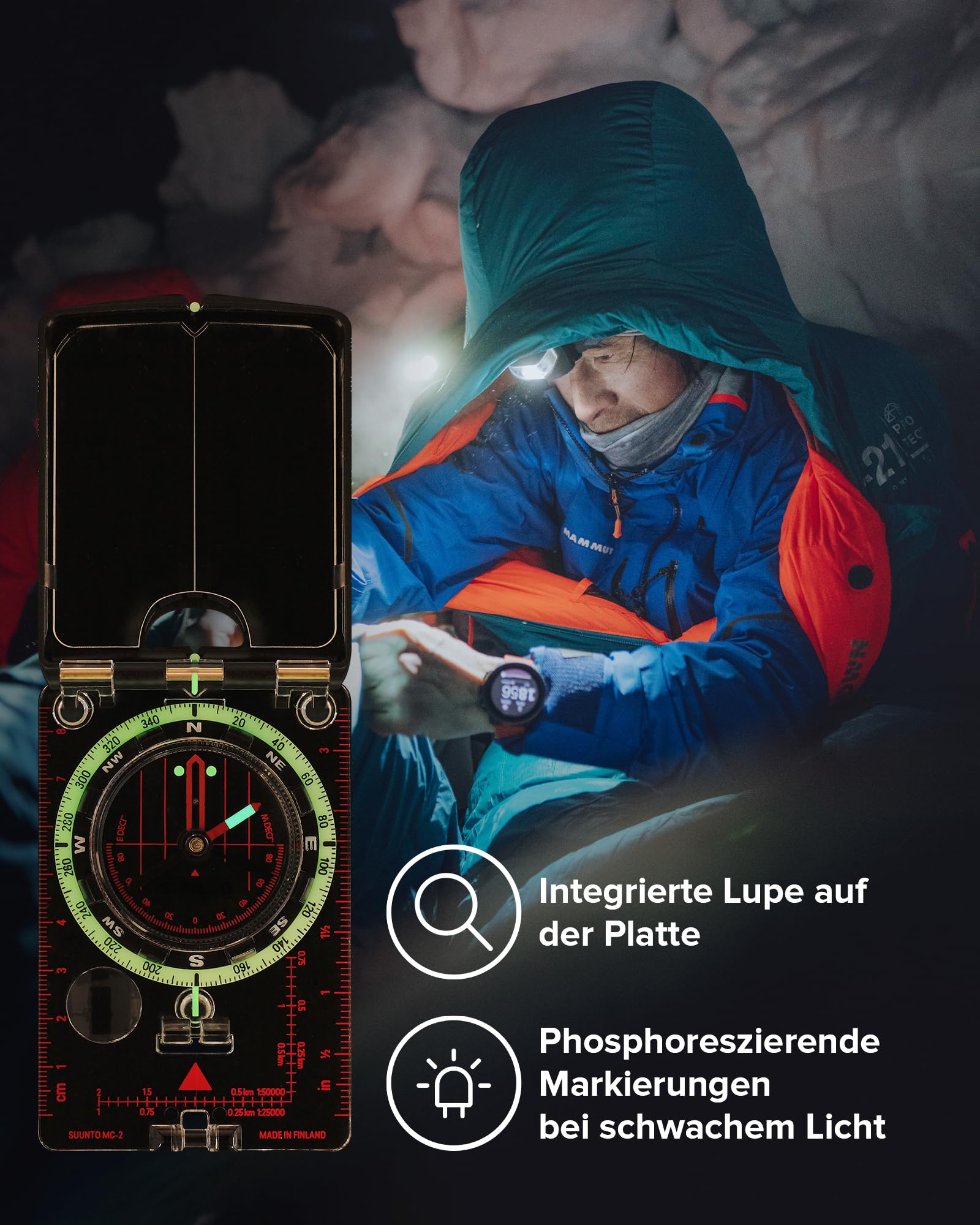 - Lieferumfang: 1x Suunto MC-2 NH Spiegelkompass, Tragekordel mit Schnellverschluss, Schlüssel zur Deklinationskorrektur, Kurzanleitung