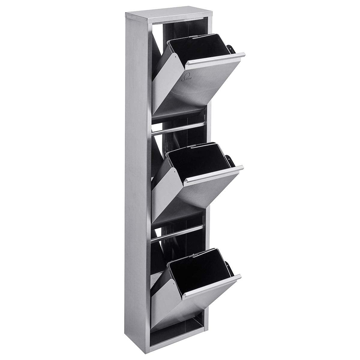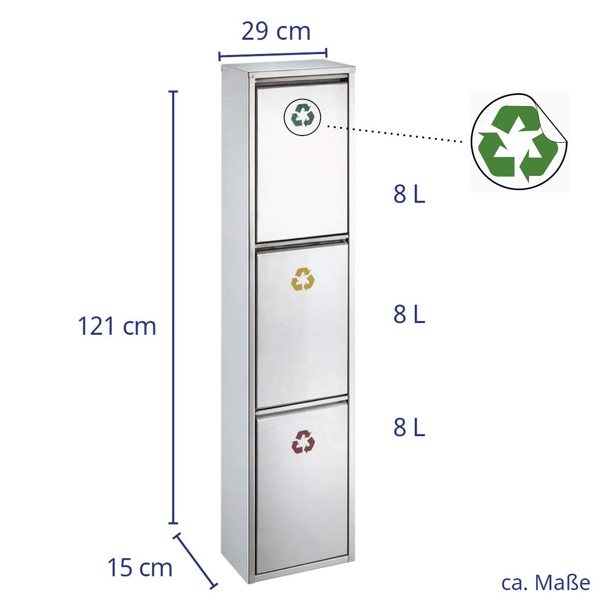 Der Abfallsammler hat ein Gesamtvolumen von 24 Litern, aufgeteilt auf drei separate Schub-Fächer mit je 8 Litern. Dank seiner schlanken Maße von ca. 29 x 15 x 121 cm (B x T x H) passt er perfekt auch in kleine Nischen.