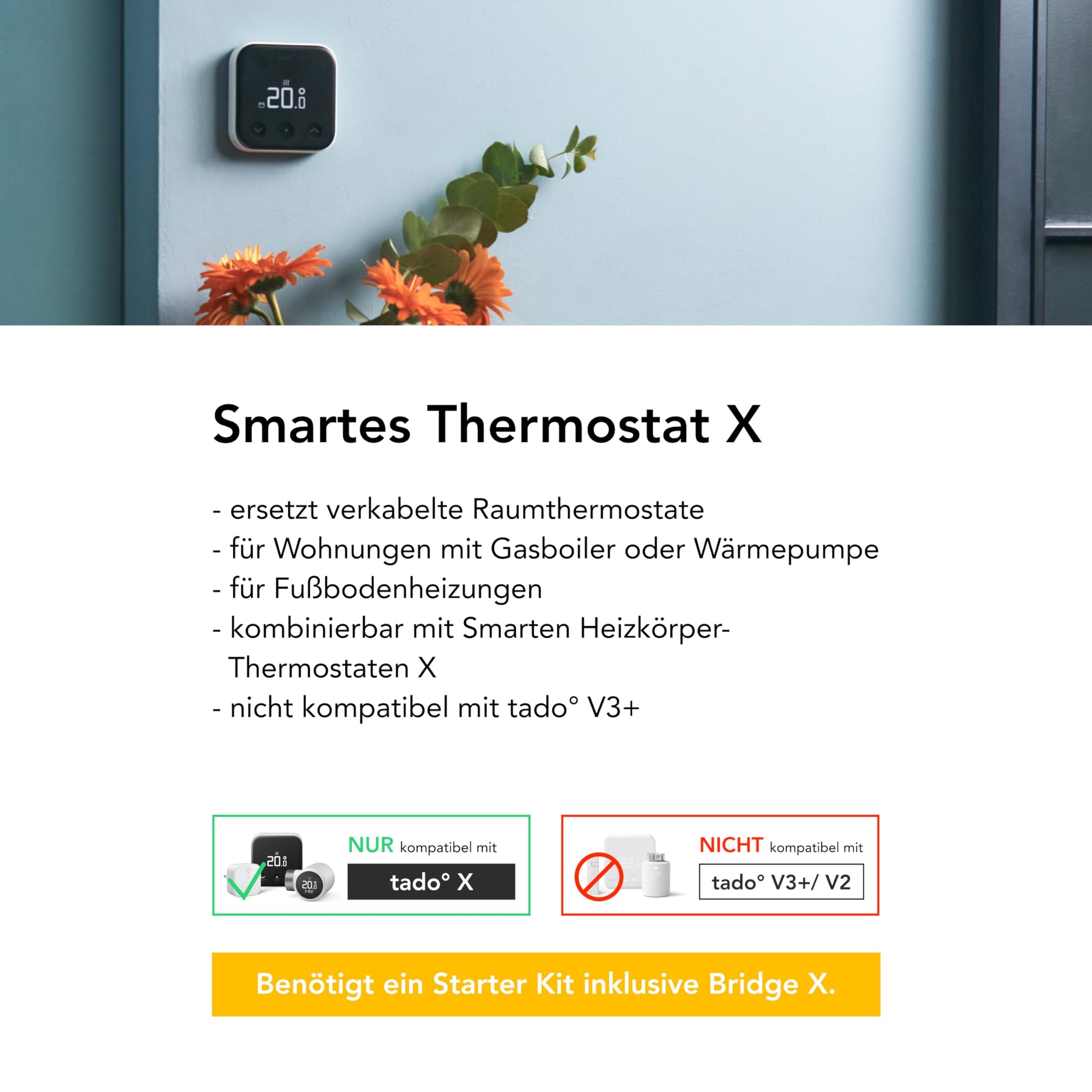 Bitte beachten Sie, dass die Produkte der tado° X-Serie nicht mit Geräten der tado° V3+ Serie oder älteren Versionen kompatibel sind. Die Nutzung von Matter und Thread setzt eine tado° Bridge X oder einen kompatiblen Thread Border Router eines Drittanbieters voraus.