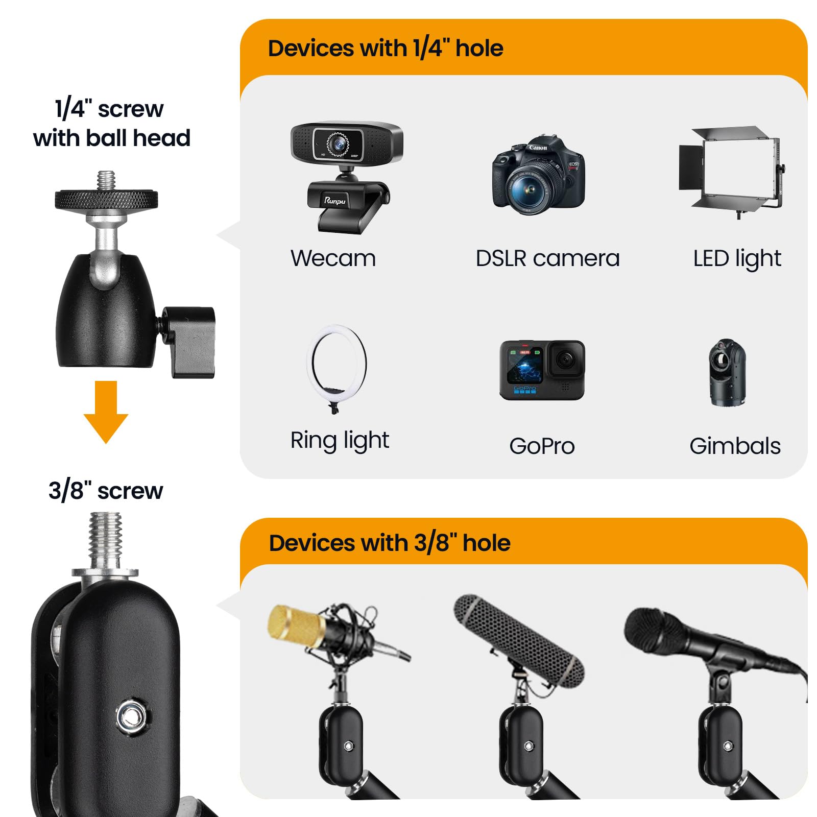Dieses Klemmstativ ist ein wahrer Alleskönner an Ihrem Arbeitsplatz. Nutzen Sie es als professionellen Kameraständer für Overhead-Videos, als Halterung für Ihr Mikrofon, Beleuchtung oder Projektoren. Die Möglichkeit, den Arm von der Klemme zu lösen, eröffnet weitere Montagemöglichkeiten: Mit dem 1/4-Zoll-Gewinde am Fuss kann er direkt auf anderen Stativen oder Lichtständern befestigt werden. Das universelle Schraubsystem mit 3/8-Zoll-Standardgewinde und 1/4-Zoll-Adapter stellt sicher, dass Sie nahezu jedes Foto- und Video-Equipment problemlos montieren können.