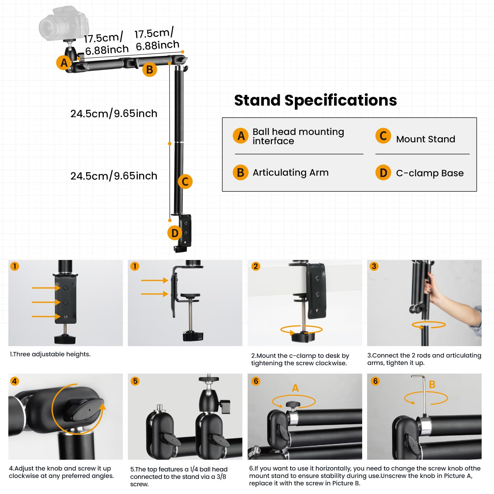 Der Arm bietet maximale Flexibilität. Mit drei individuell justierbaren Gelenken, die eine 180°-Neigung und 360°-Rotation ermöglichen, können Sie mühelos jede erdenkliche Position einstellen – ideal für präzise Overhead-Aufnahmen, Produktfotografie oder die perfekte Ausleuchtung Ihres Arbeitsplatzes.