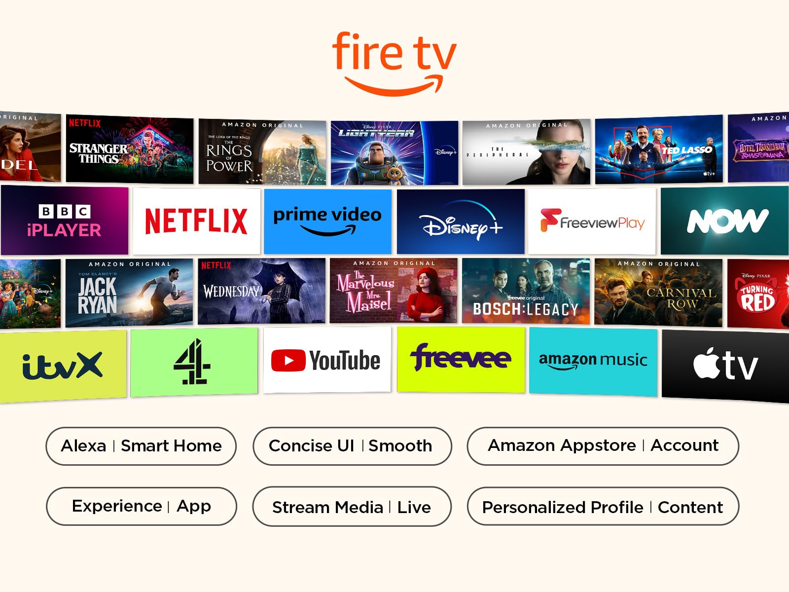 Dieser Smart-TV ist mit dem integrierten Fire OS 7 System ausgestattet. Dadurch haben Sie direkten Zugriff auf Tausende von Apps und Kanälen wie Netflix, Prime Video, YouTube oder Disney+ (Abonnements können erforderlich sein), die Sie einfach installieren und nutzen können.