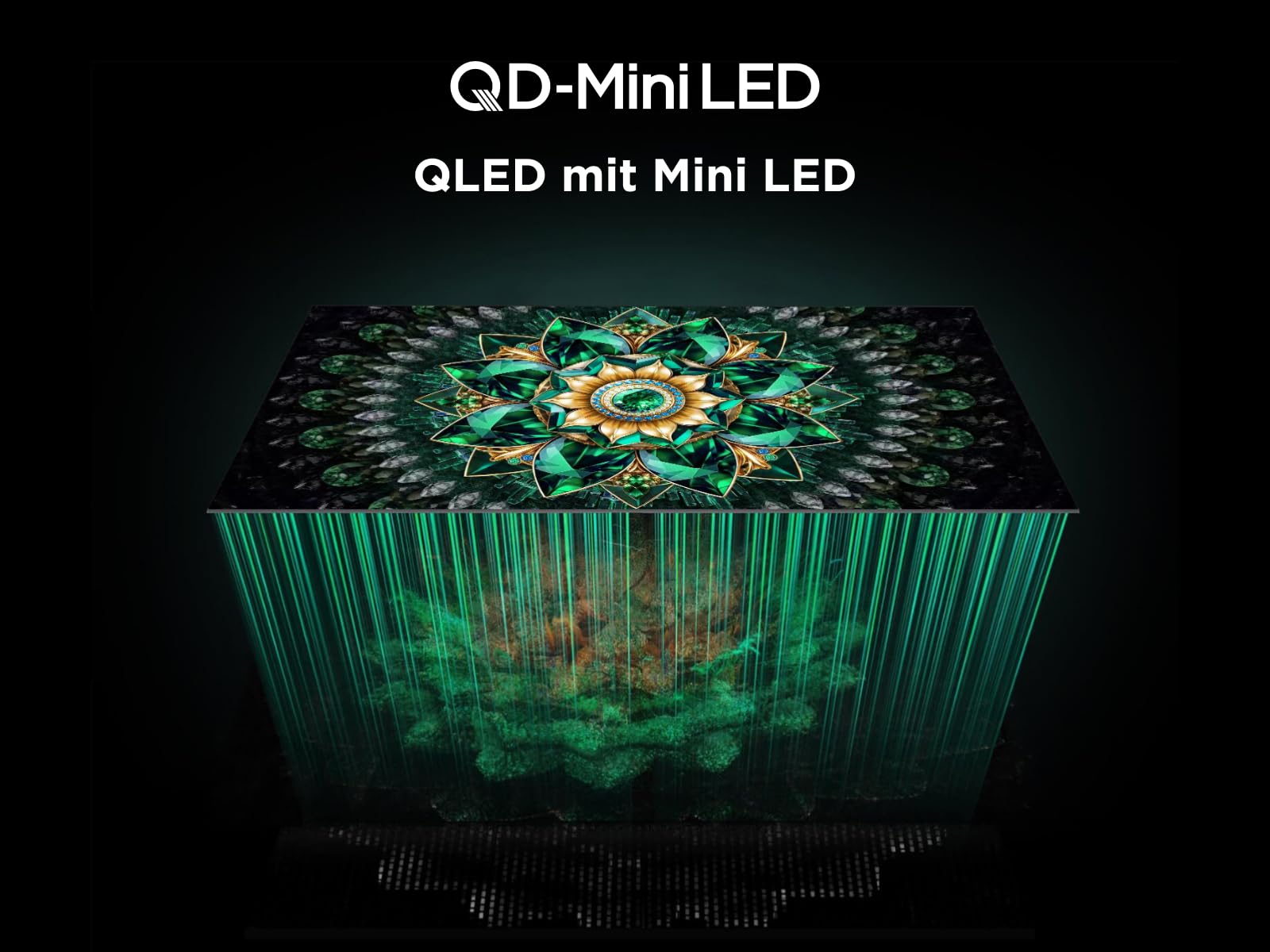 - Display-Technologie: QD-Mini LED mit QLED, 4K HDR Premium 2600 und 97 % DCI-P3 Farbraumabdeckung.