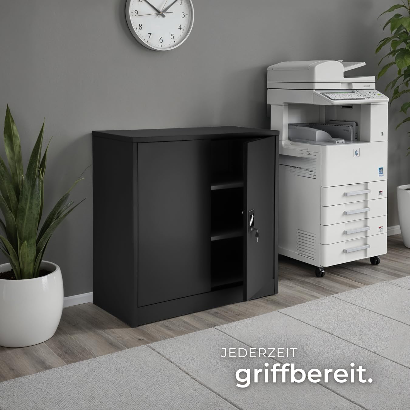 Der Schrank verfügt über abschliessbare Türen mit einem robusten Sicherheits-Zylinderschloss, um Ihre Dokumente und Wertsachen zuverlässig vor unbefugtem Zugriff zu schützen. Im Lieferumfang sind zwei passende Schlüssel für das Schloss enthalten.