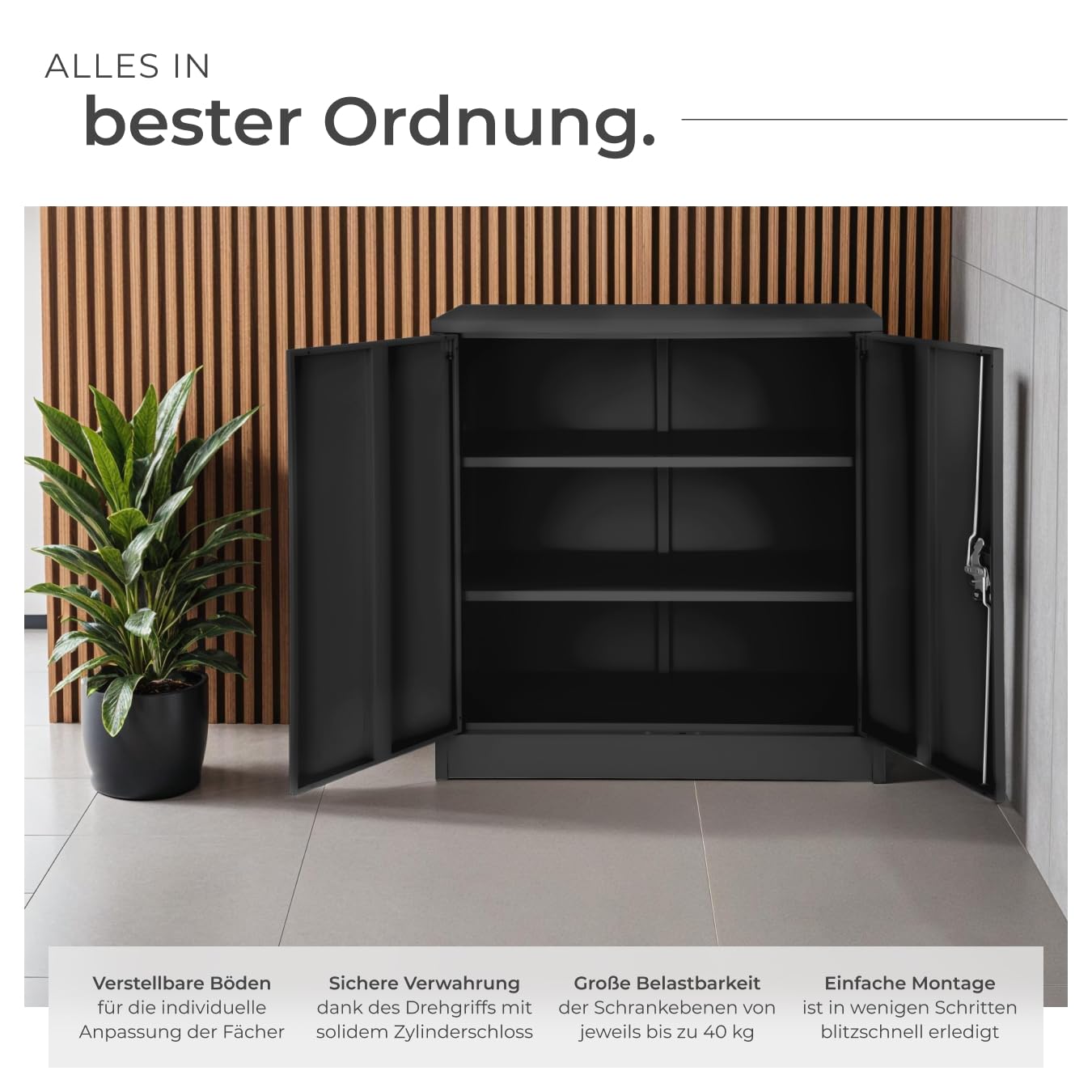 Der Schrank enthält drei Einlegeböden, die Sie individuell in der Höhe verstellen können, um den Stauraum optimal an Ordner, Werkzeug oder andere Utensilien anzupassen. Jeder Boden ist für eine gleichmässig verteilte Last von bis zu 40 kg ausgelegt, was eine stabile Lagerung ermöglicht.
