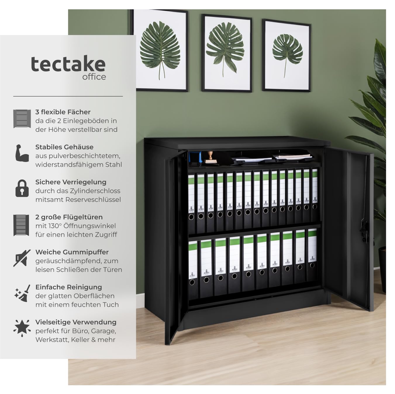 Dank des zuverlässigen Zylinderschlosses bleiben Ihre Akten, Ordner und persönlichen Gegenstände jederzeit vor unbefugtem Zugriff geschützt. Die drei grosszügigen Fächer, deren Höhe Sie flexibel anpassen können, ermöglichen eine perfekt auf Ihre Bedürfnisse zugeschnittene Organisation und schaffen im Handumdrehen Ordnung.