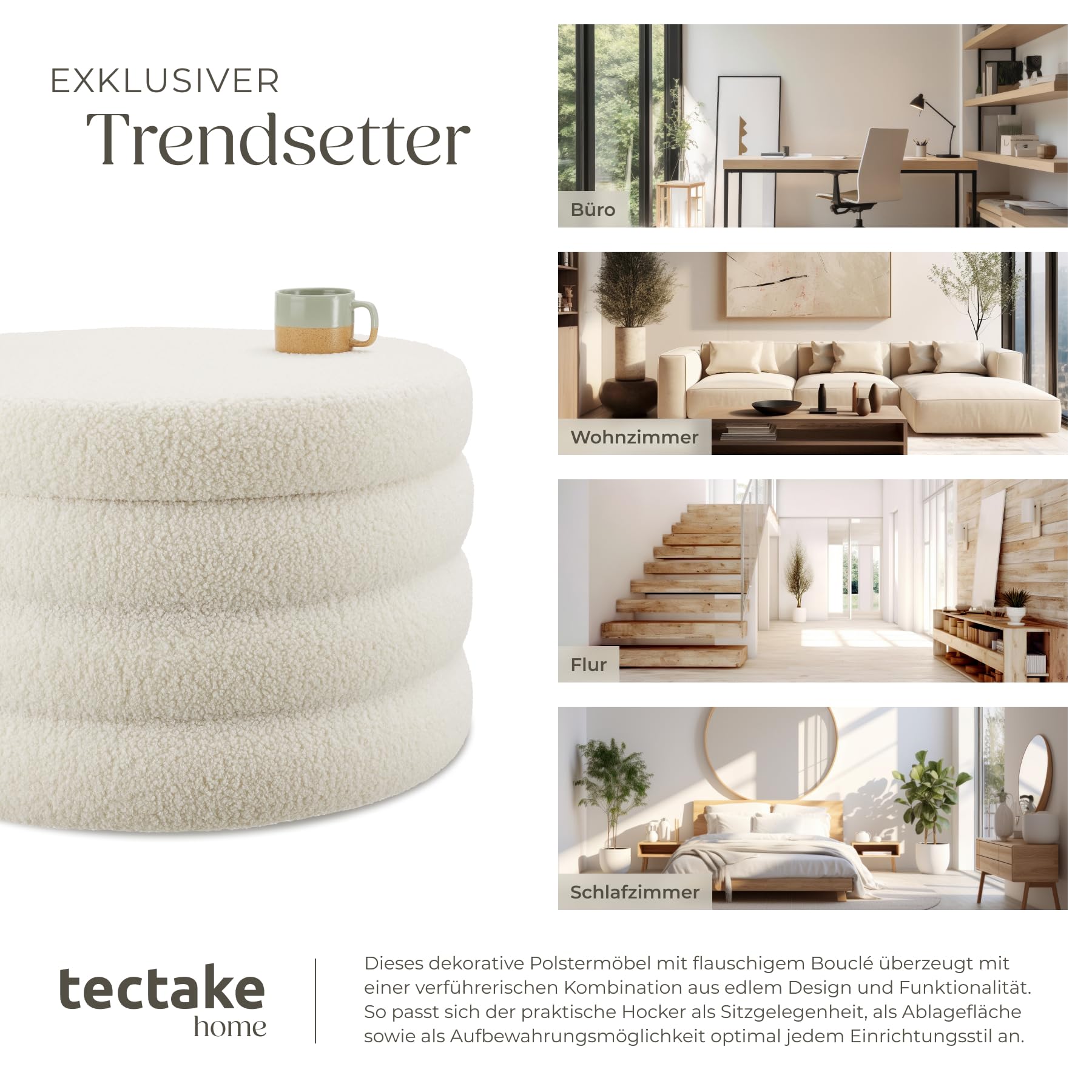 tectake® XL Scandi Stauraum Hocker Pouf – Bouclé Creme-weiss