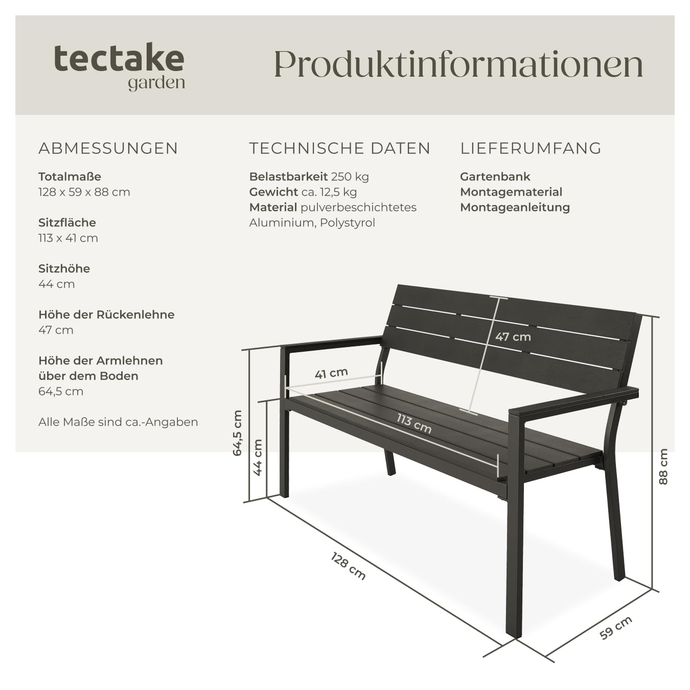 Die glatten Oberflächen der Bank sind besonders pflegeleicht und lassen sich mühelos mit einem feuchten Tuch reinigen. Der Aufbau gestaltet sich dank der verständlichen Anleitung unkompliziert und schnell, sodass Sie Ihre neue Sitzgelegenheit im Freien im Handumdrehen geniessen können.