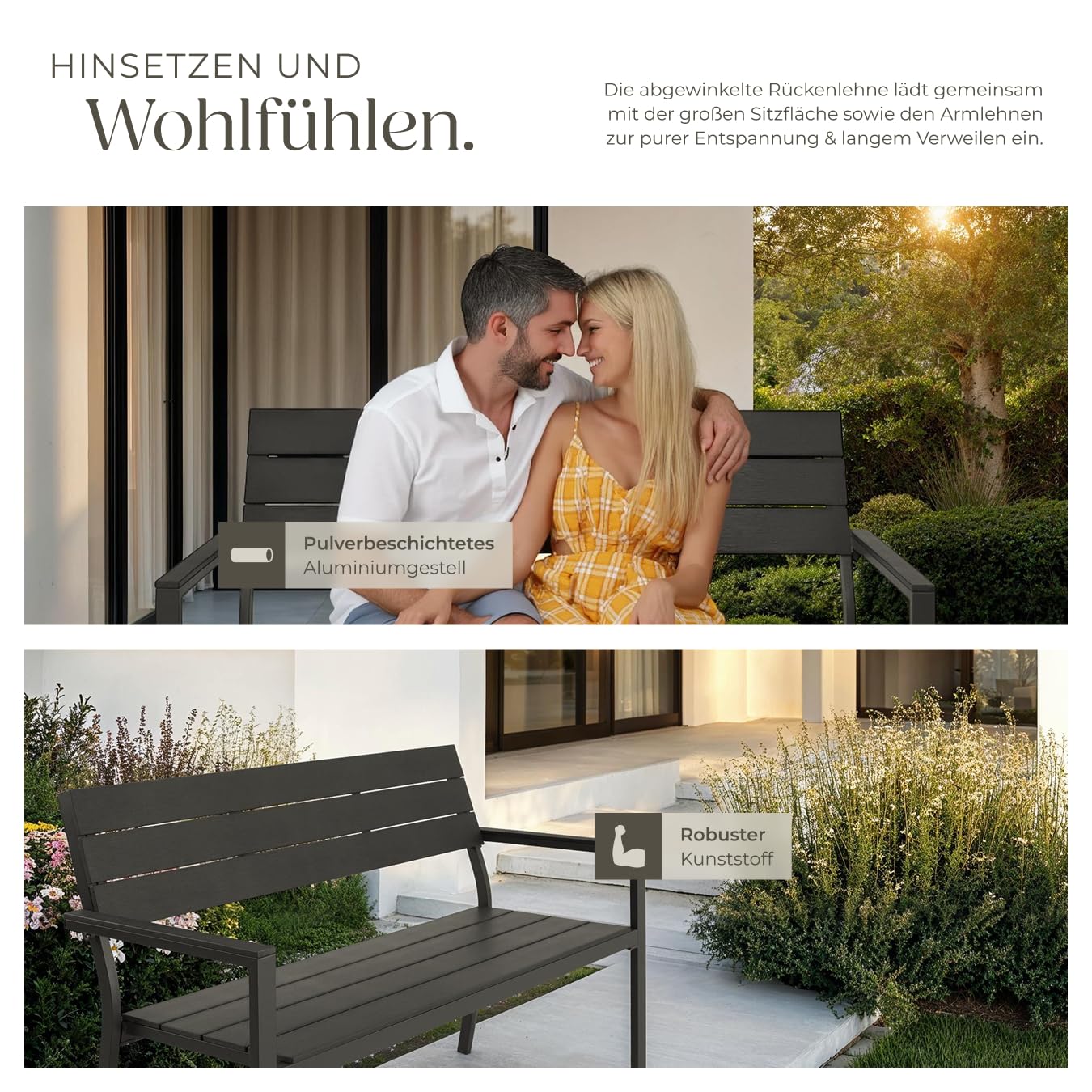Geniessen Sie entspannte Momente auf einer Bank, die Ästhetik, Komfort und Widerstandsfähigkeit perfekt vereint.