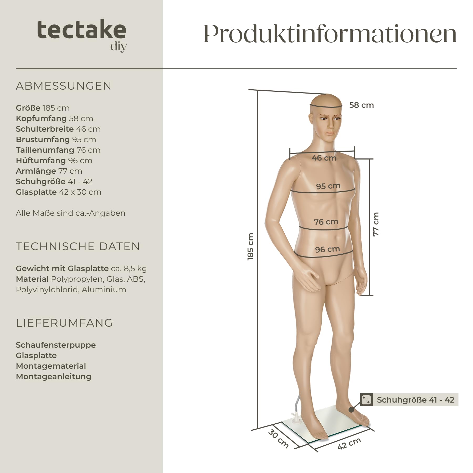 Die Schaufensterpuppe bietet dank einer robusten Glasplatte und einem Wadendorn aus Aluminium eine hohe Stabilität. Die Befestigung an der Wade hat den grossen Vorteil, dass Sie der Figur problemlos Schuhe (passend für Grösse 41-42) anziehen können.