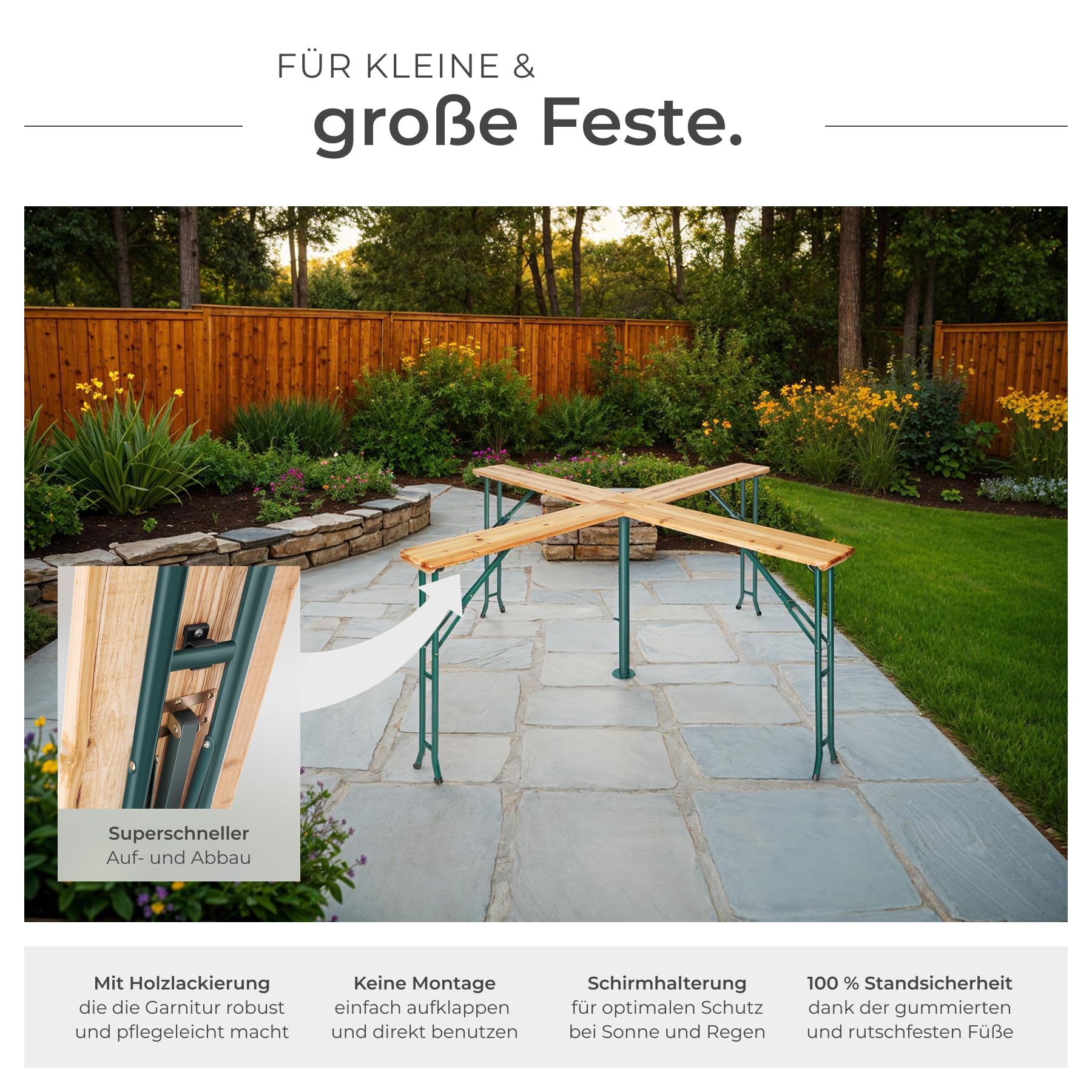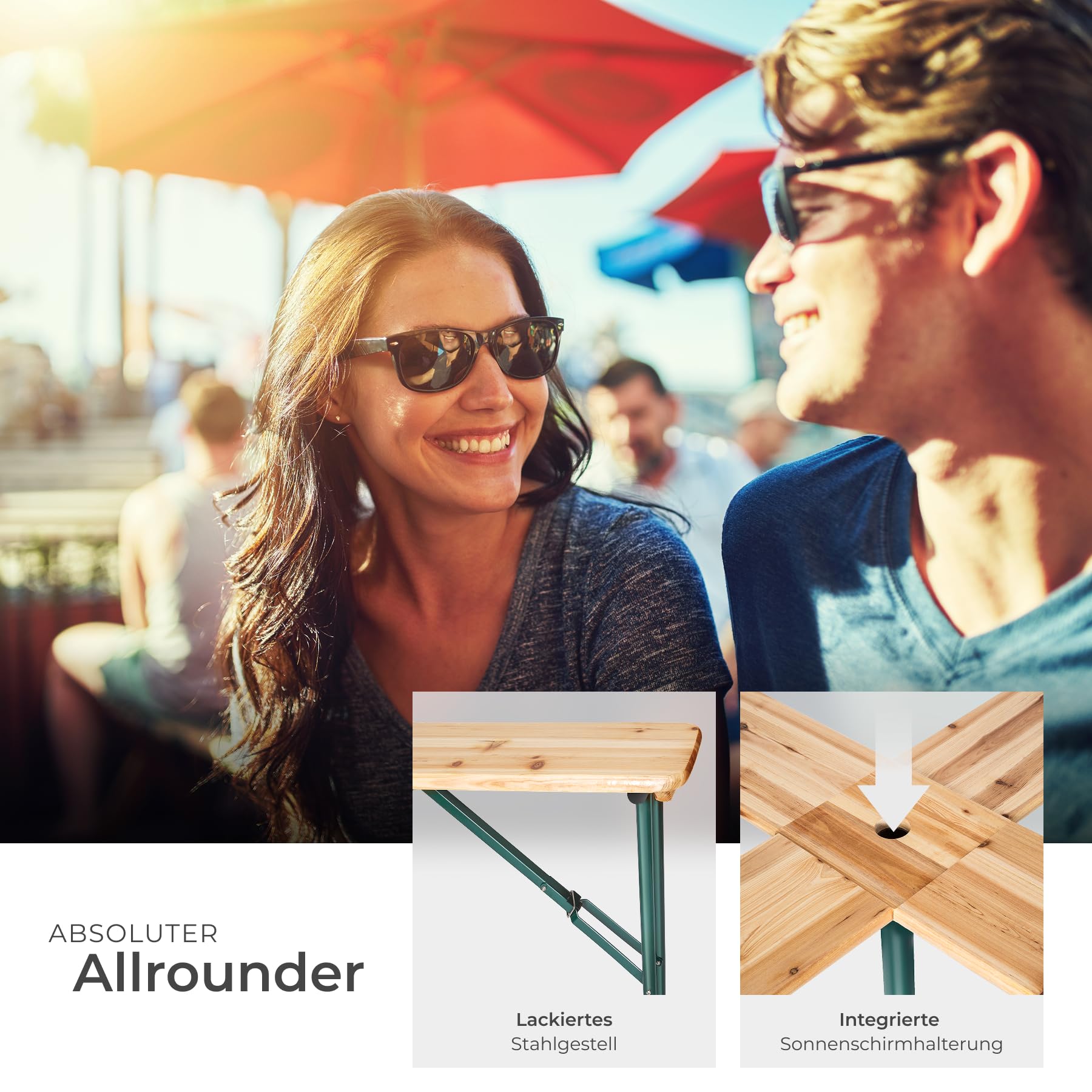 - Integrierte Halterung in der Tischmitte für einen Sonnenschirm
