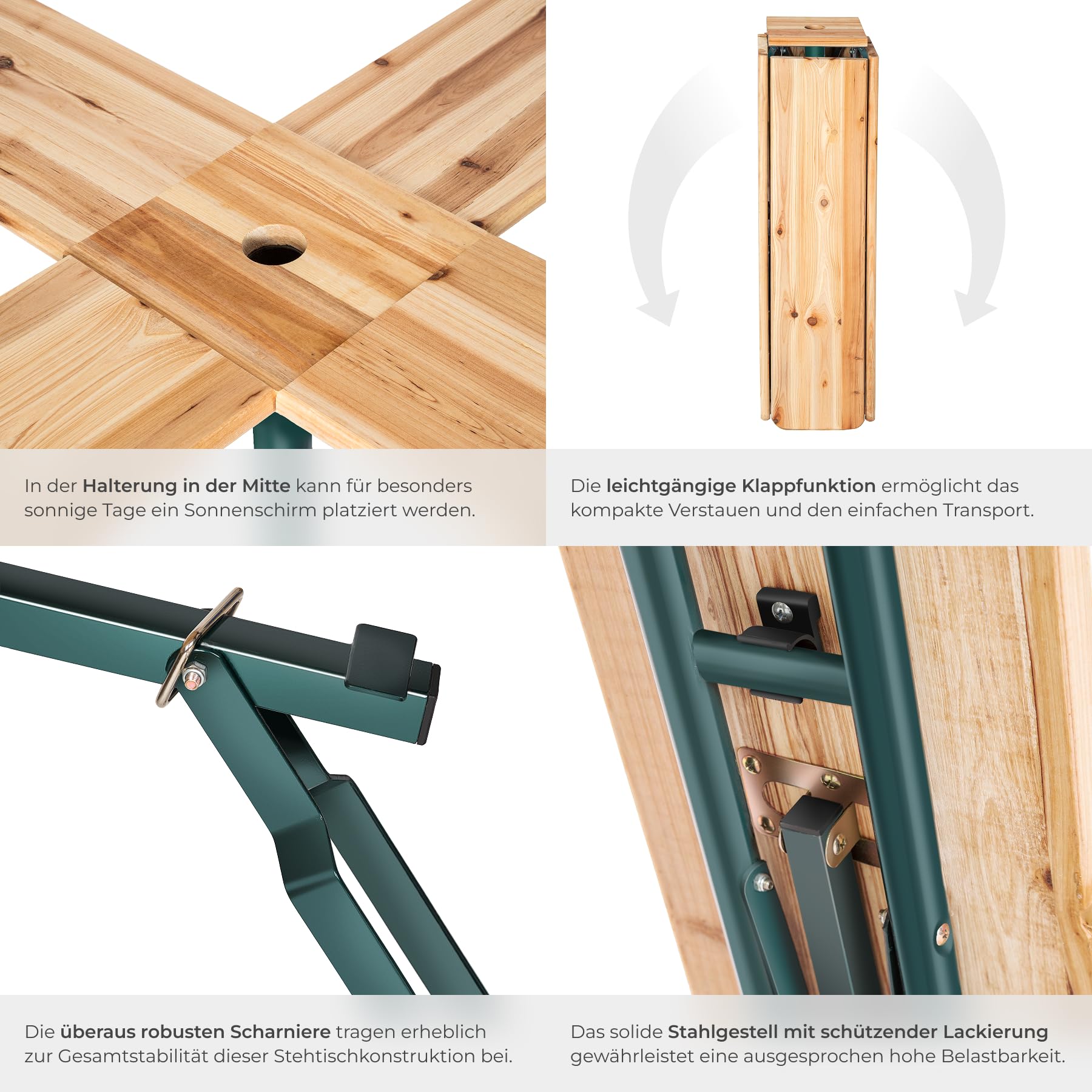 Dank seiner hochwertigen Verarbeitung ist dieser Stehtisch äusserst robust und langlebig. Das solide Stahlgestell und die speziell behandelte Holzoberfläche trotzen den Elementen, was den Tisch zur perfekten Bierzeltgarnitur für zahlreiche Gartenpartys und Events macht. Die Pflege ist dabei denkbar einfach, sodass er über Jahre hinweg sein ansprechendes Aussehen behält.