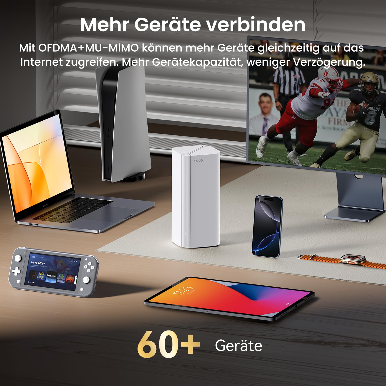 • Hohe Kapazität für moderne Haushalte: Dank MU-MIMO- und OFDMA-Technologie versorgt das System über 60 Geräte gleichzeitig mit einem stabilen und verzögerungsfreien Signal – ideal für Smart Homes.