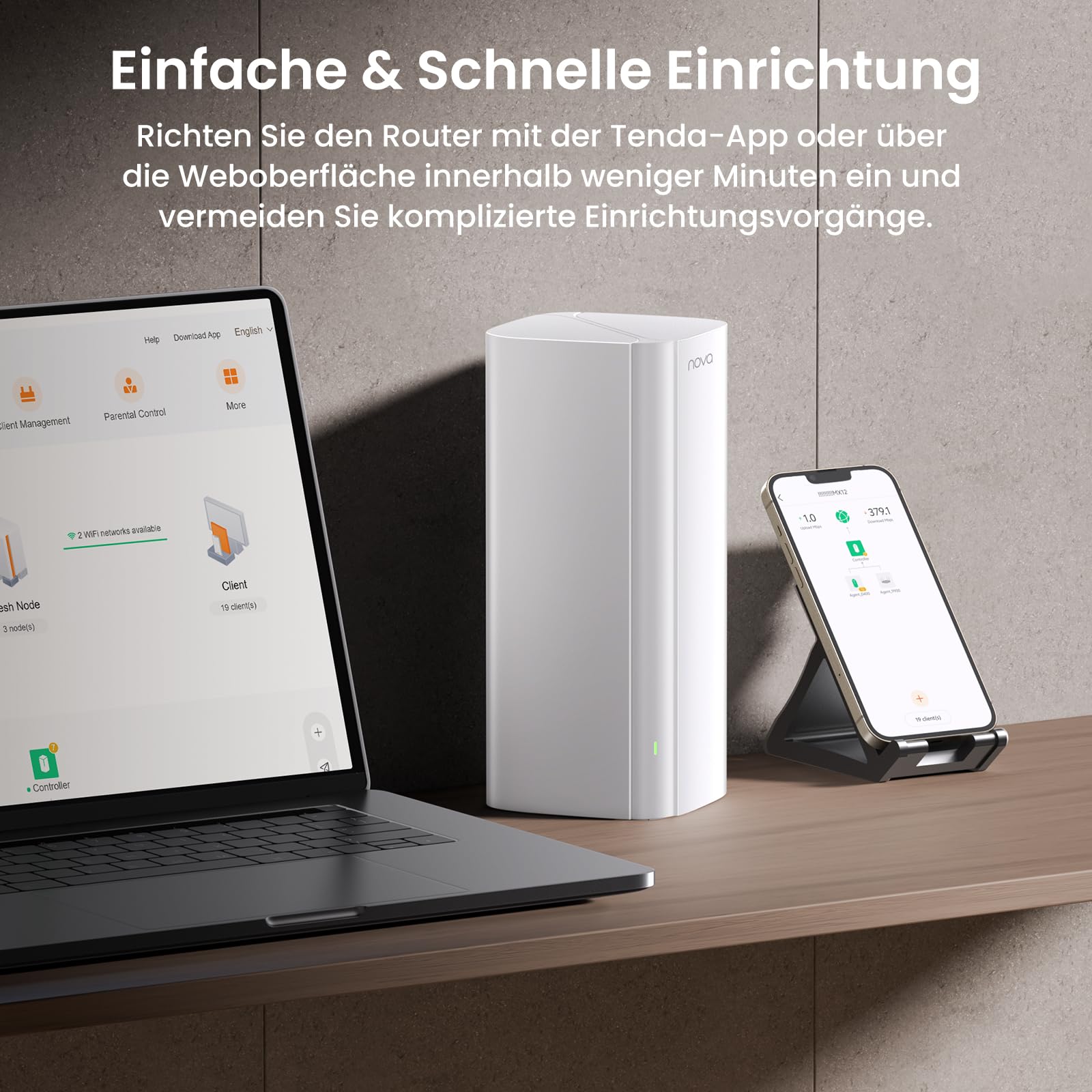 • Kinderleichte Einrichtung und Verwaltung: Richten Sie Ihr Netzwerk in wenigen Minuten über die intuitive Tenda Wi-Fi App oder die Weboberfläche ein. Neue Stationen lassen sich per Knopfdruck hinzufügen.