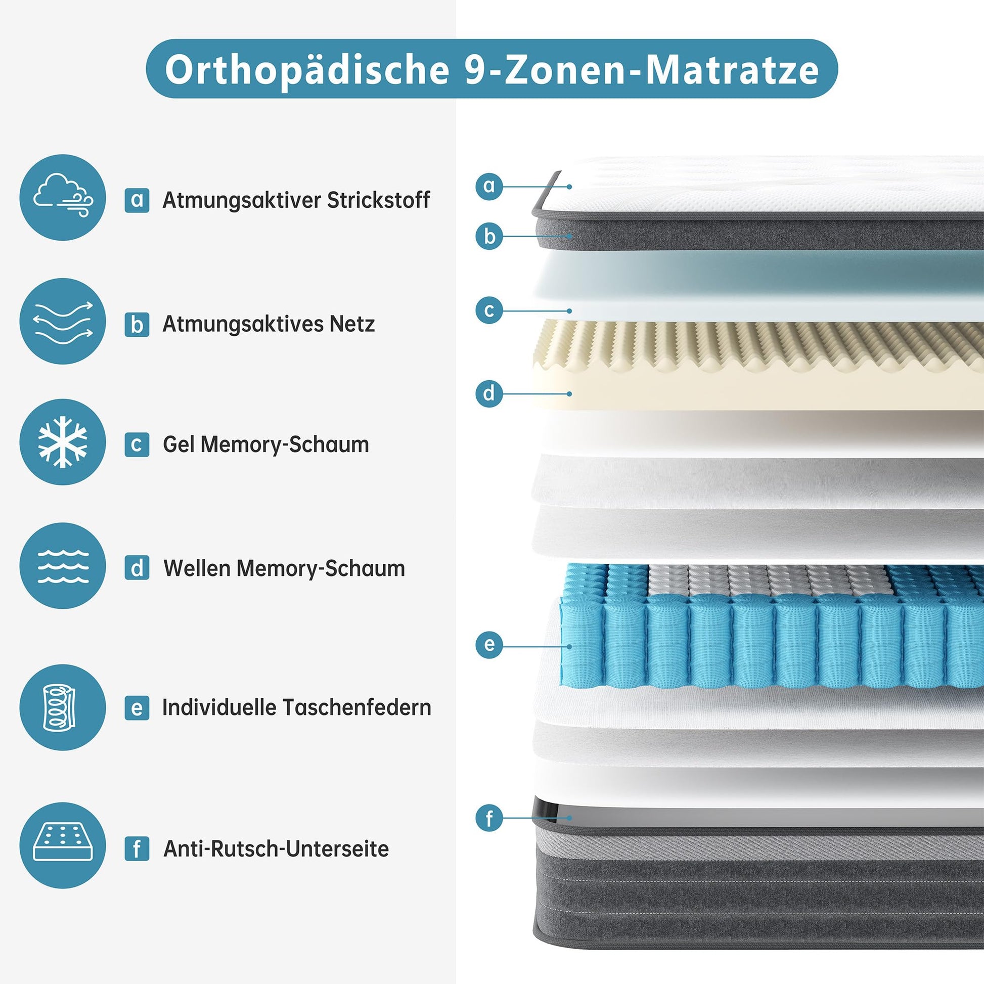- 9-Zonen-Struktur: Bietet eine punktgenaue Unterstützung für verschiedene Körperbereiche, von Kopf bis Fuss.