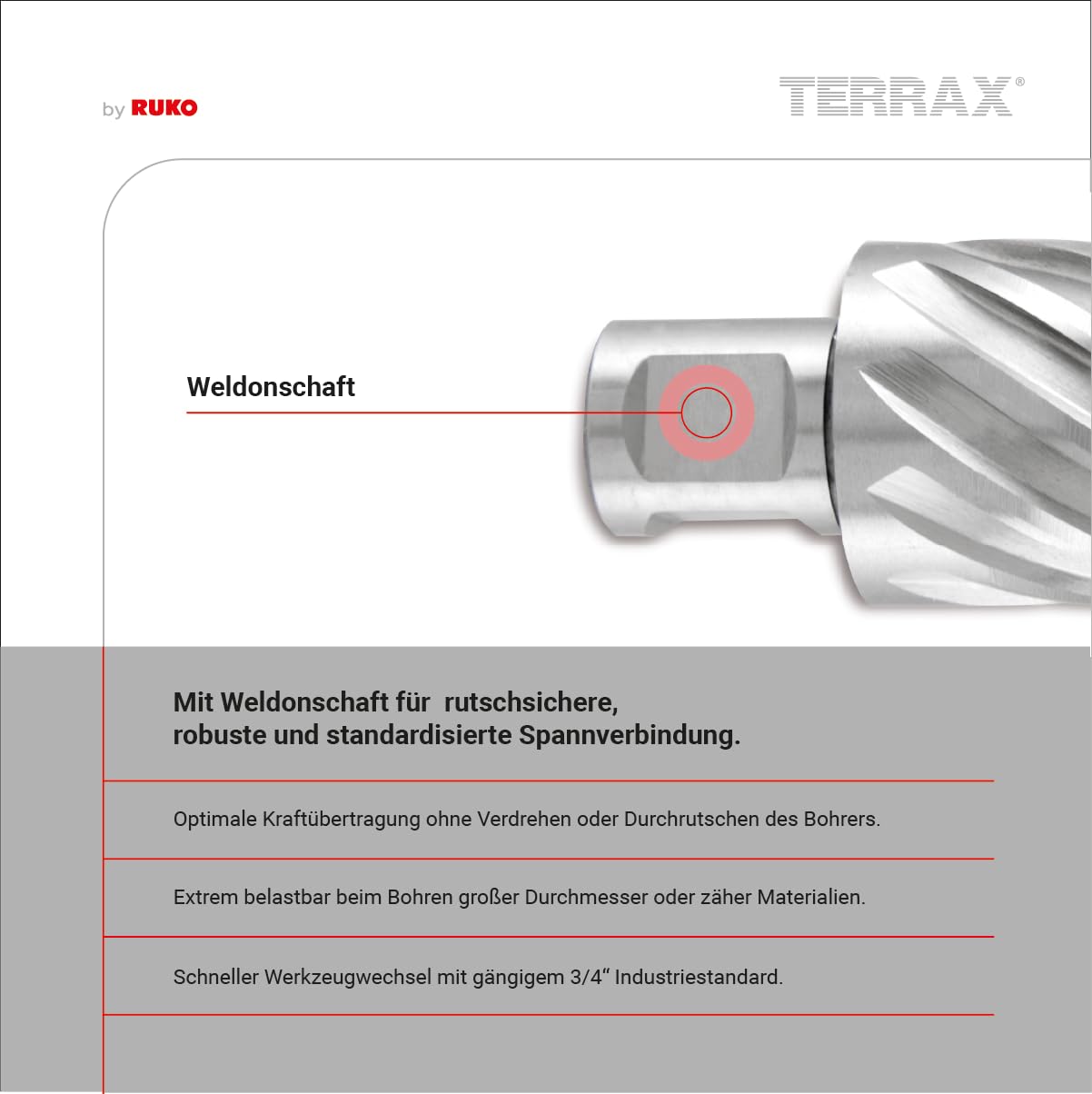 Der 3/4" Weldonschaft ist eine standardisierte Aufnahme für Kernbohrer mit seitlichen Spannflächen. Diese sorgen für eine sichere, formschlüssige Verbindung in der Maschine, verhindern ein Durchrutschen und garantieren eine optimale Kraftübertragung. Er ist mit den meisten gängigen Magnet-Kernbohrmaschinen kompatibel.