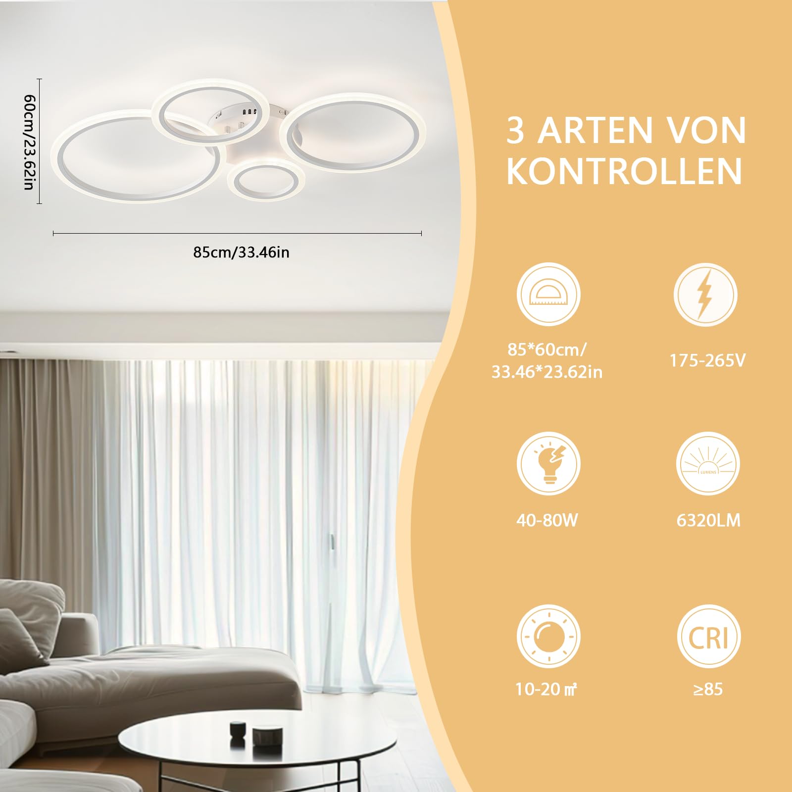 Diese Deckenleuchte ist mit ihrer Leistung von 40W - 80W und einem Lichtstrom von 6320 Lumen ideal für Räume mit einer empfohlenen Grösse von 10 bis 20 Quadratmetern geeignet. Sie passt perfekt als Hauptbeleuchtung in moderne Wohn- oder Schlafzimmer.