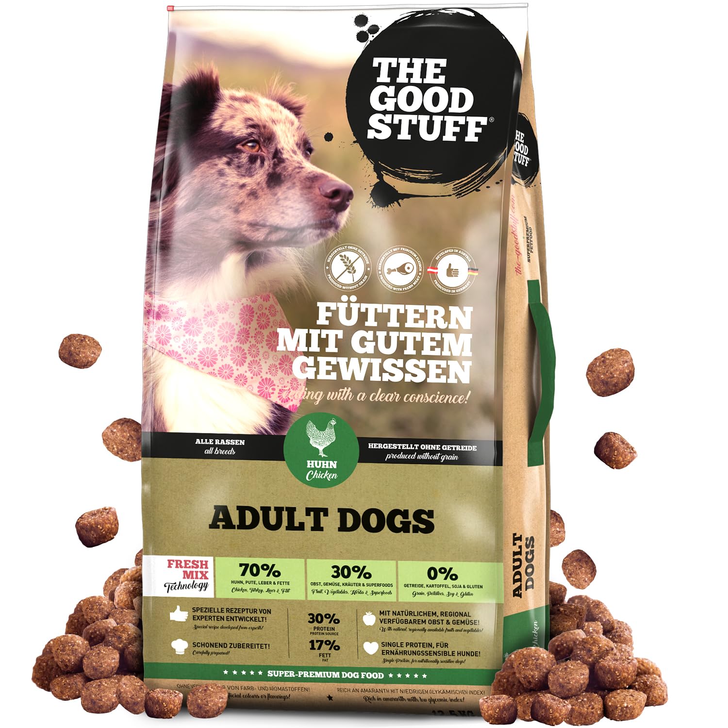 Die hohe Qualität basiert auf einem Anteil von 70 % frischem Hühnerfleisch, einer komplett getreidefreien Rezeptur und dem bewussten Verzicht auf Fleischmehl, künstliche Farb-, Aroma- oder Konservierungsstoffe sowie Zucker. Das schonende FRESH-MIX Herstellungsverfahren sichert zudem den maximalen Erhalt wertvoller Nährstoffe.