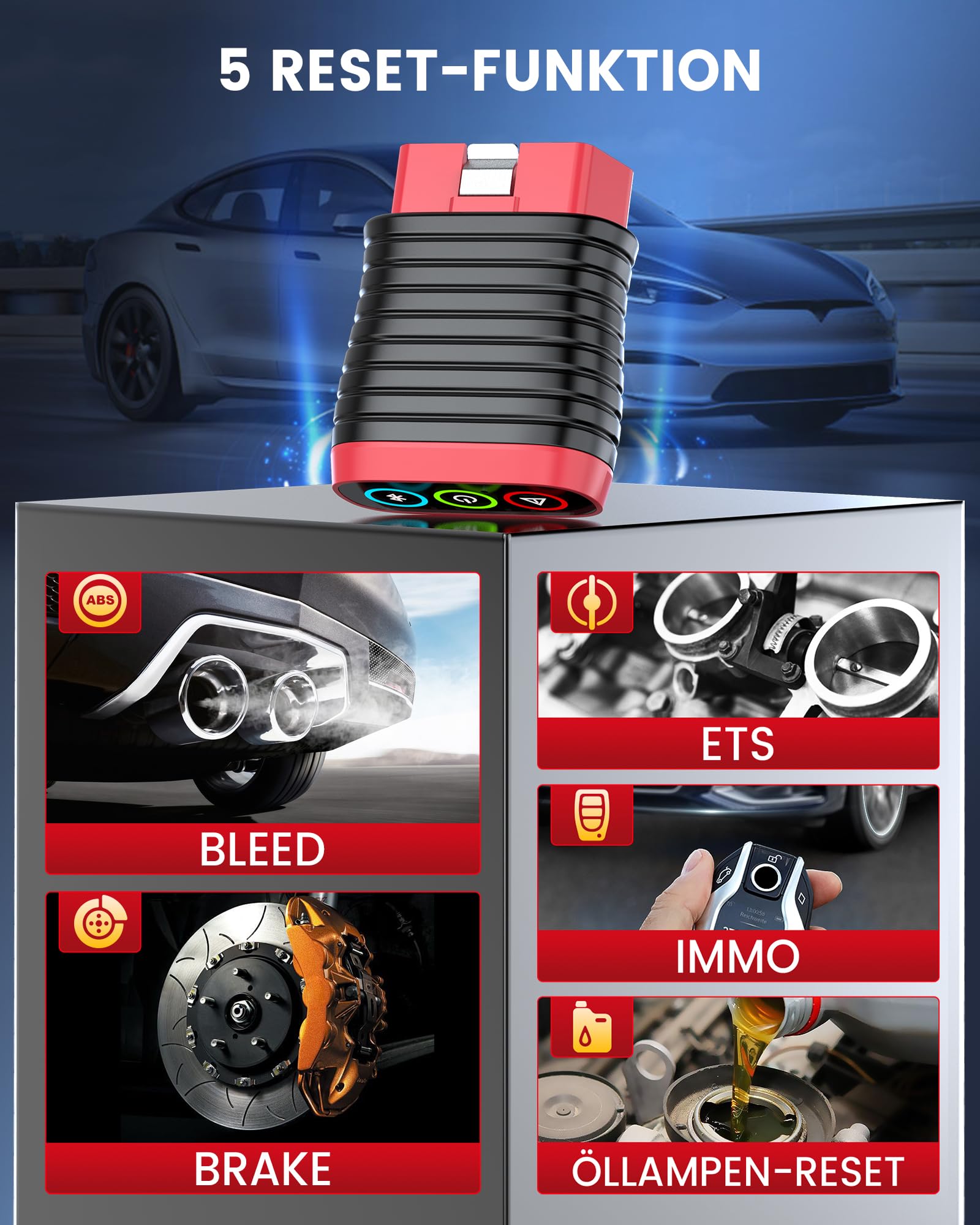 - Fünf kostenlose Servicefunktionen: Beinhaltet lebenslang kostenfreie Wartungsfunktionen für Öl-Service-Reset, Bremsen-Reset (Brake), ABS-Entlüftung (Bleed), Wegfahrsperren-Anpassung (IMMO) und elektronischen Drosselklappen-Reset (ETS).