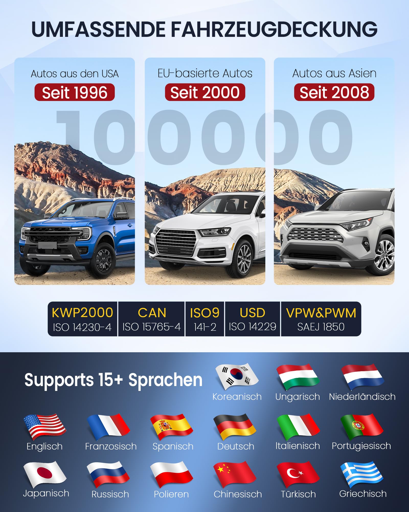 - Breite Fahrzeugabdeckung: Identifiziert Fahrzeuge automatisch und ist mit über 126 Marken und mehr als 10'000 Modellen weltweit kompatibel, darunter die meisten 12-Volt-PKWs, SUVs und Kleinlaster ab Baujahr 1996 (USA), 2000 (Europa) bzw. 2008 (Asien).