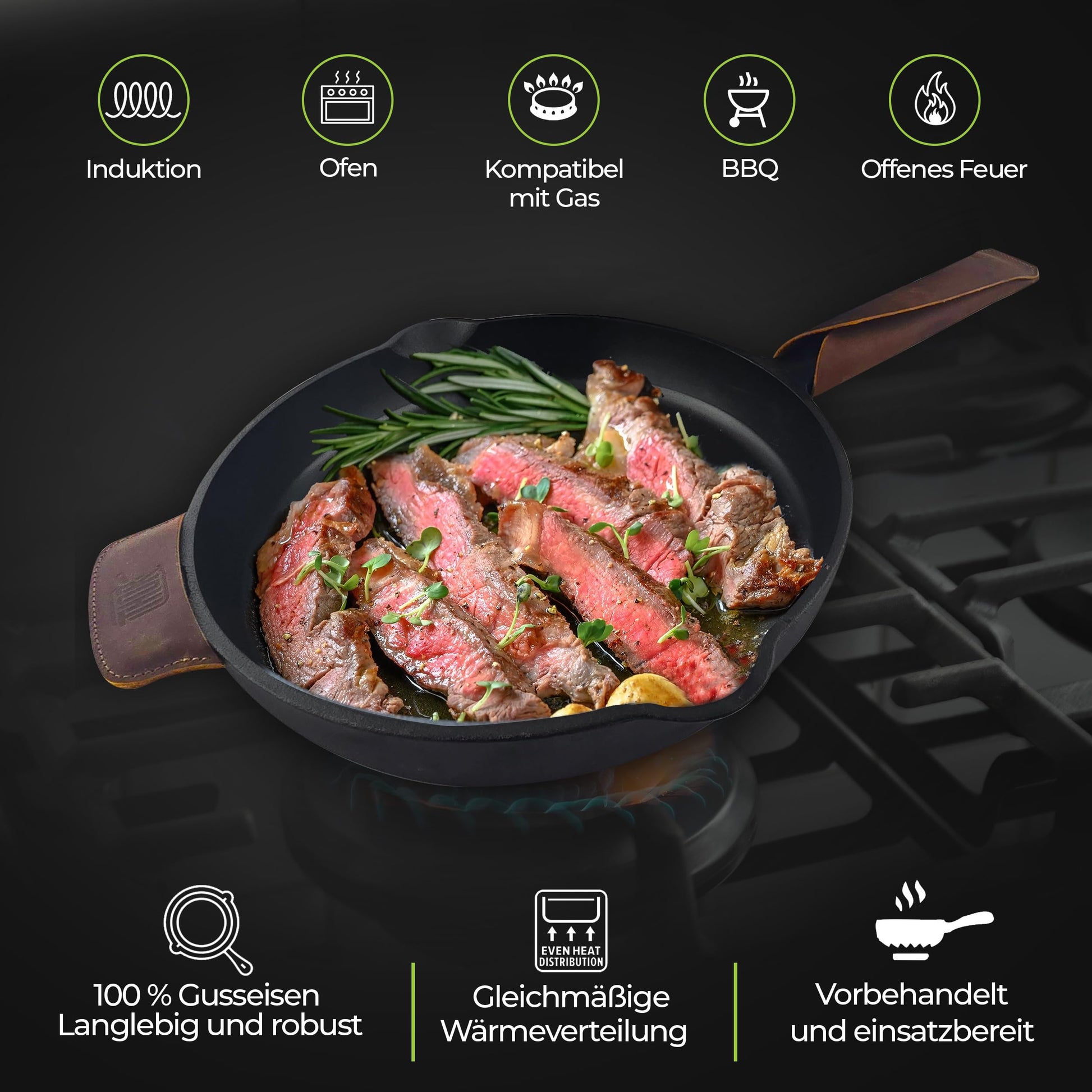 Die Pfanne ist universell einsetzbar und funktioniert auf allen gängigen Herdarten, einschliesslich Induktion. Zusätzlich können Sie sie problemlos im Backofen, auf dem Gasgrill oder sogar über offenem Feuer verwenden.