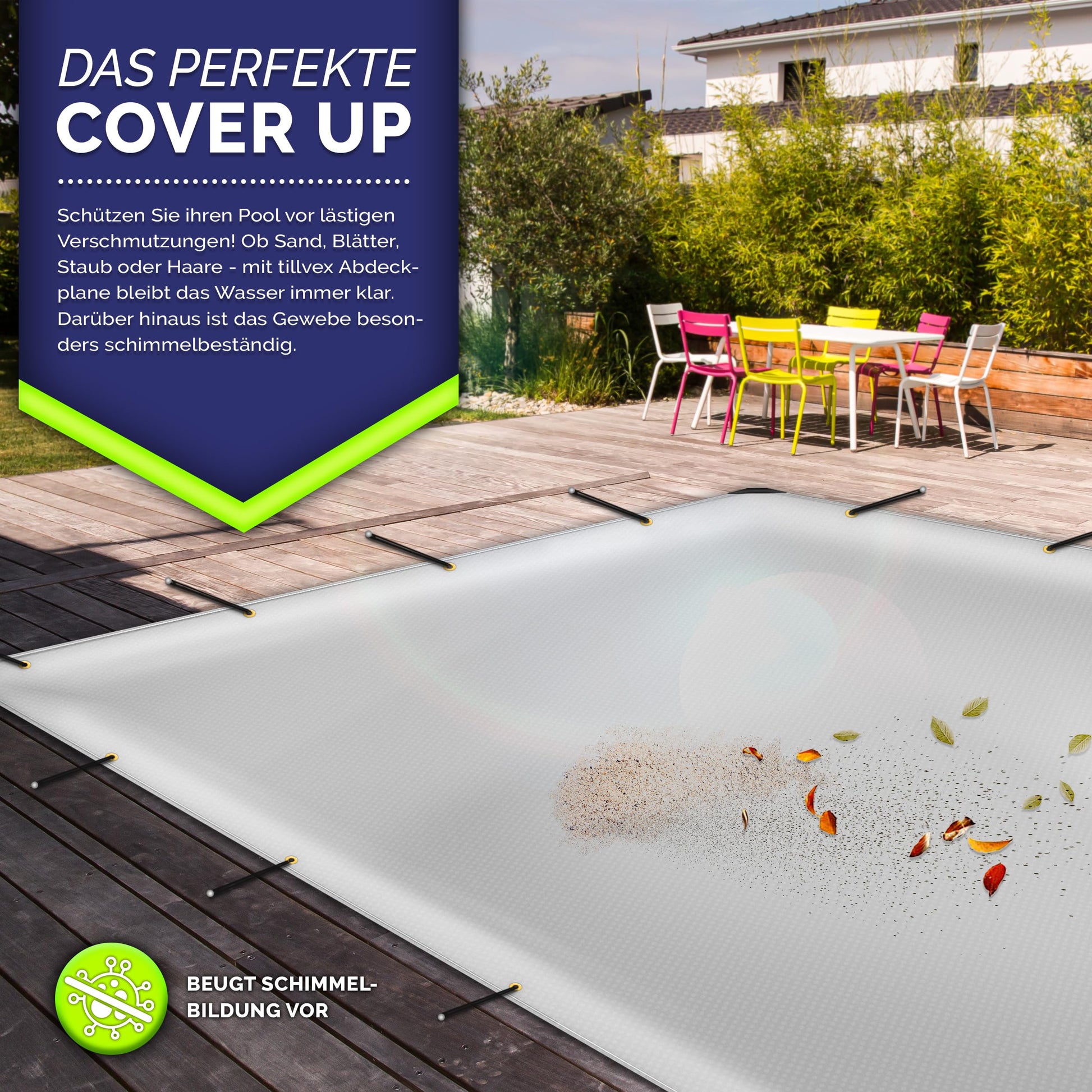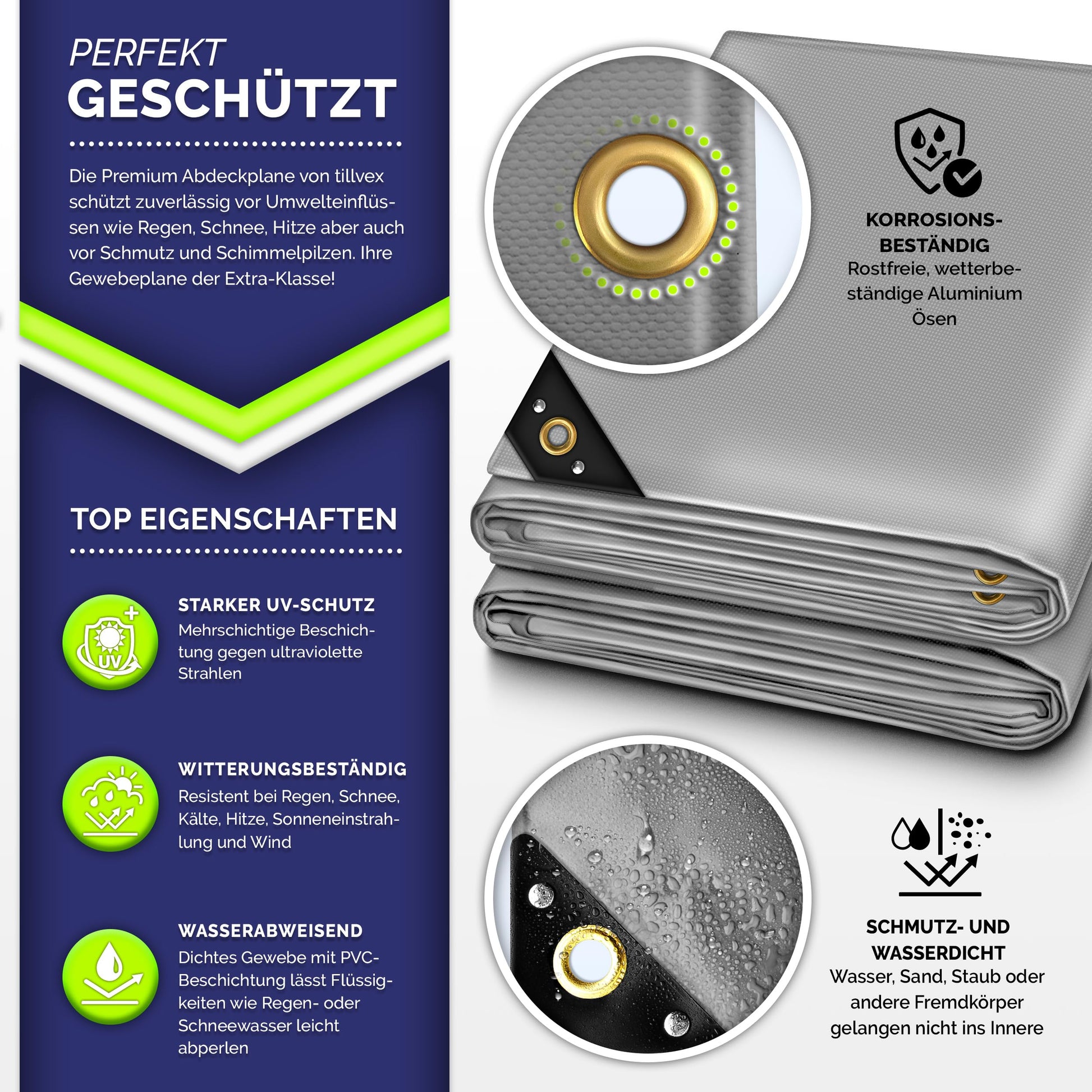 Absolut. Die Plane ist zu 100% wasserdicht und schützt Ihr Eigentum zuverlässig vor Regen und Schnee. Zudem ist sie UV-beständig, was beispielsweise das Ausbleichen von Gartenmöbeln durch starke Sonneneinstrahlung verhindert. Dank ihrer Schwerentflammbarkeit bietet sie zusätzliche Sicherheit.