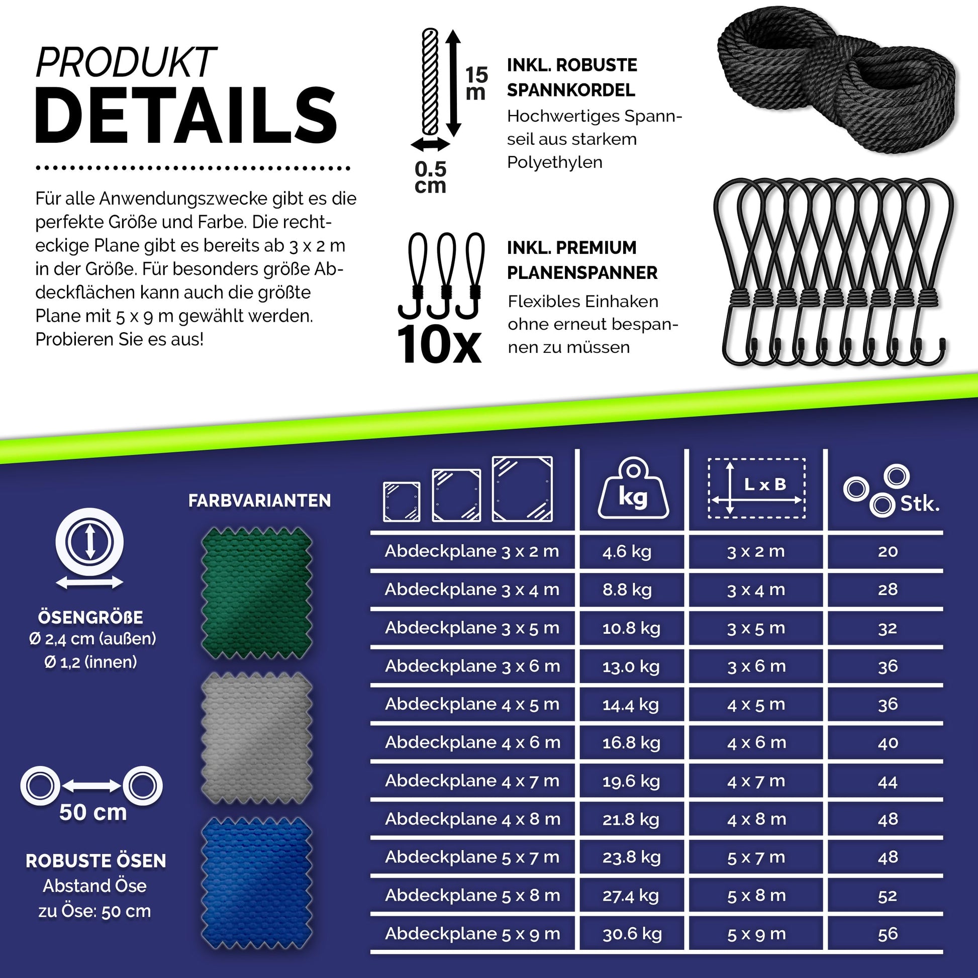 - Komplettes Zubehör-Set: Im Lieferumfang sind 10 Spanngummis mit Haken sowie ein 15 Meter langes Befestigungsseil enthalten.