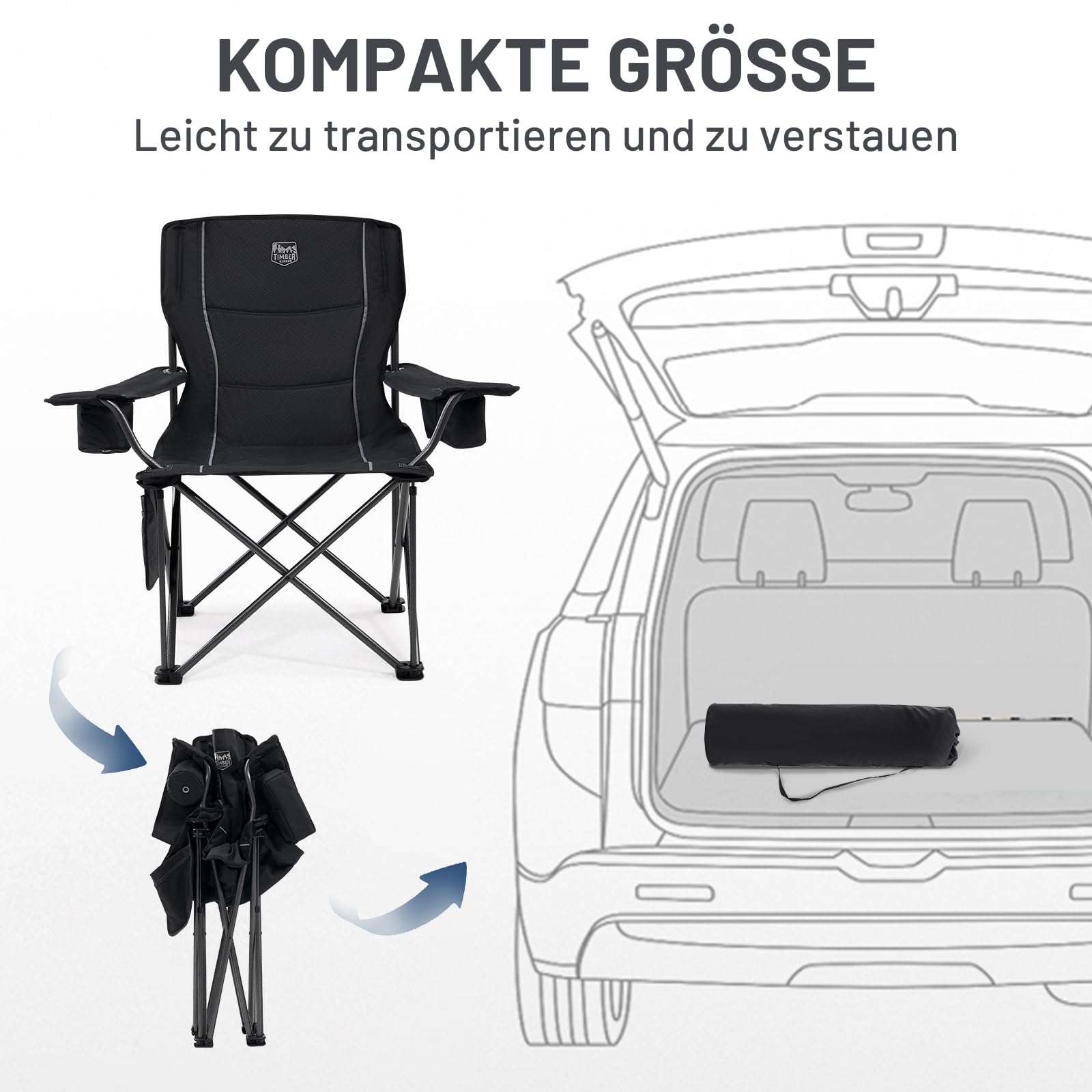 Erleben Sie unübertroffenen Sitzkomfort, selbst bei längerem Verweilen. Die Kombination aus der breiten Sitzfläche und der hochwertigen, weichen Polsterung sorgt für eine optimale Druckverteilung und macht diesen Stuhl zur perfekten Wahl für entspannte Stunden beim Camping, Angeln oder auf Festivals.