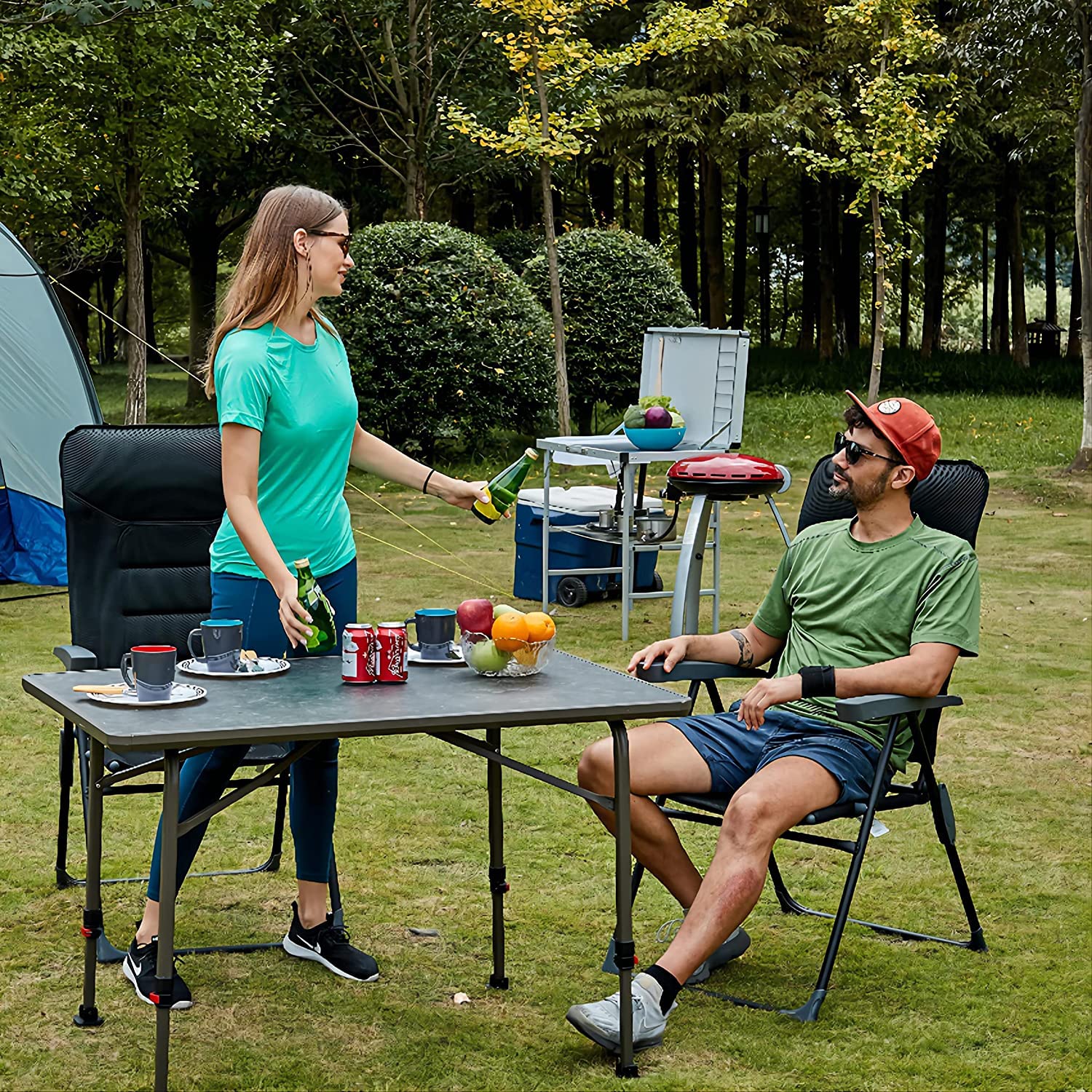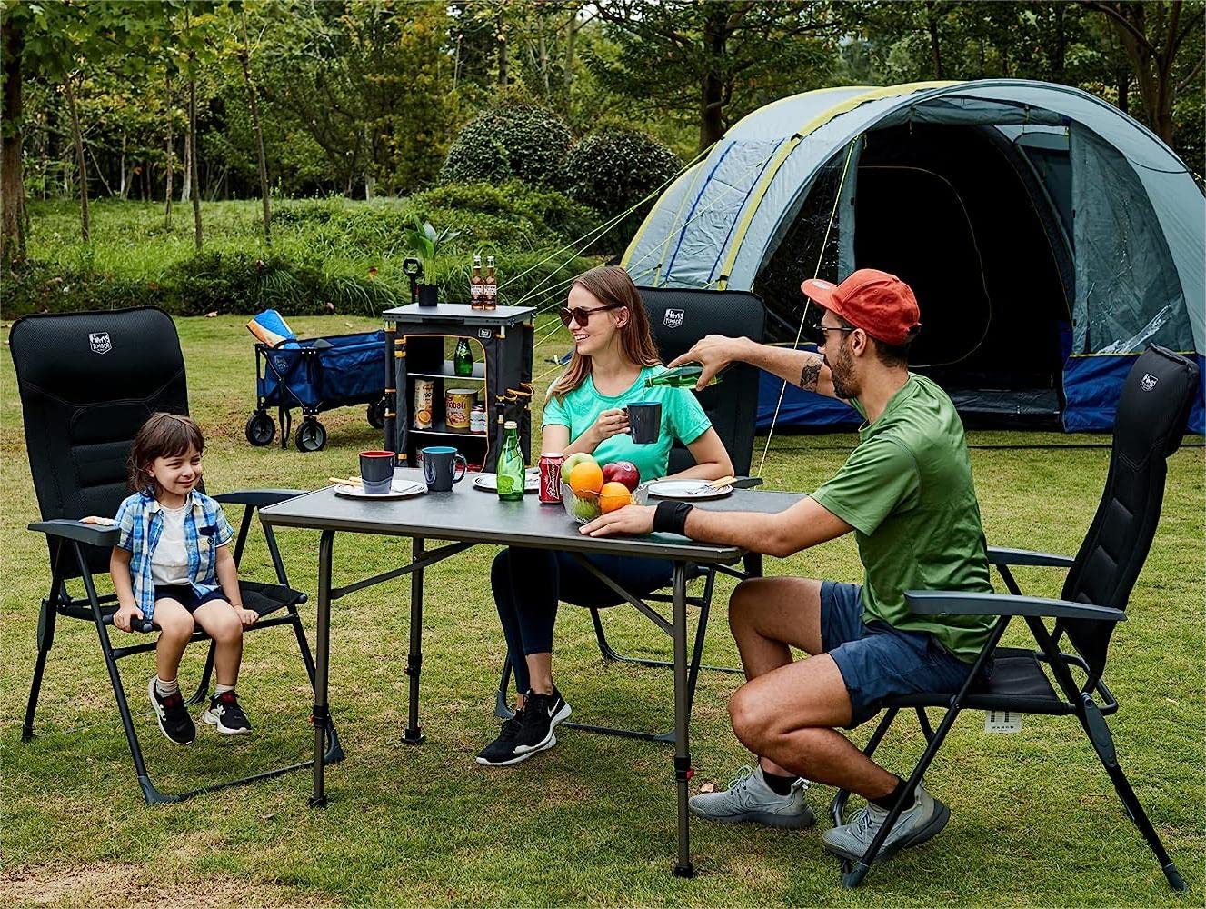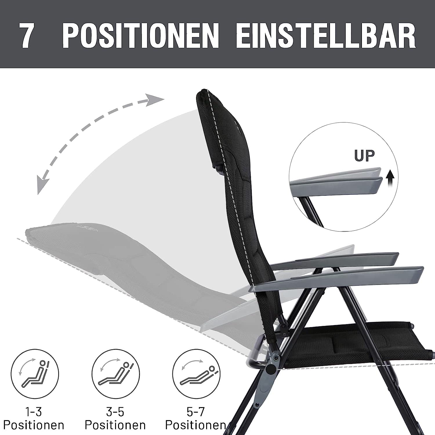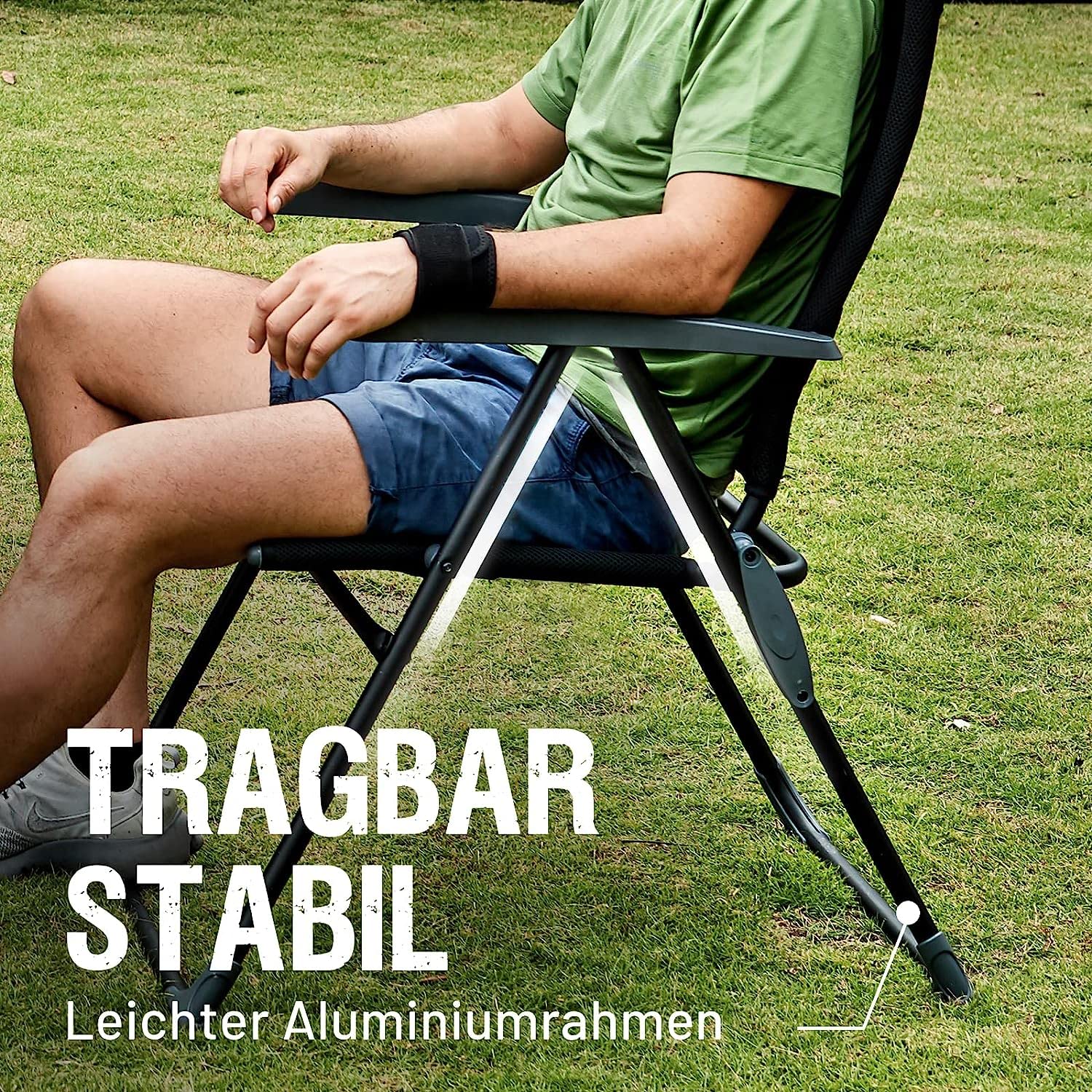 Die grosszügig dimensionierte, hohe Rückenlehne bietet eine ausgezeichnete Unterstützung für den gesamten Rücken und ist auch für grössere Personen bestens geeignet. Trotz seiner soliden Bauweise ist der Stuhl dank des leichten Aluminiums mühelos zu tragen. Er ist der ideale Begleiter für Campingausflüge, Tage am See oder den spontanen Einsatz auf der Terrasse.
