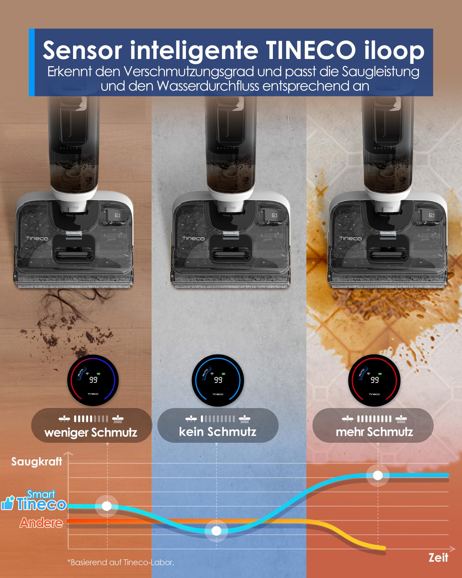 - Intelligenter iLoop™-Sensor: Passt die Reinigungsleistung und den Wasserfluss automatisch an den erkannten Verschmutzungsgrad an.